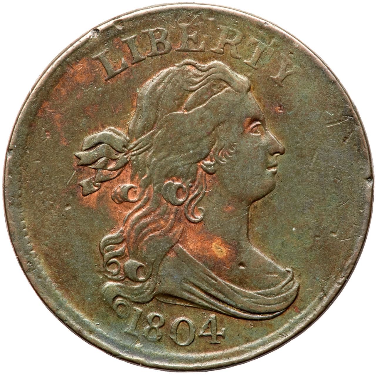 Slightly sharper but lightly cleaned and retoned glossy light olive with splashes of lighter reddish brown on the obverse. No roughness and only minor contact marks, but the uneven retoning on the obverse is distracting. MDS. This piece has the appearance of a broadstruck half cent with wider than normal rims and flattened dentils, but that determination is up for debate.