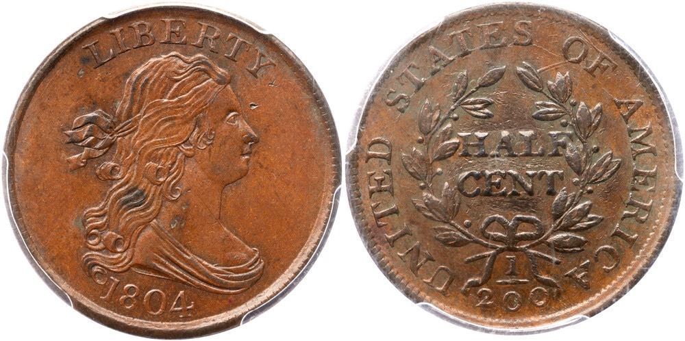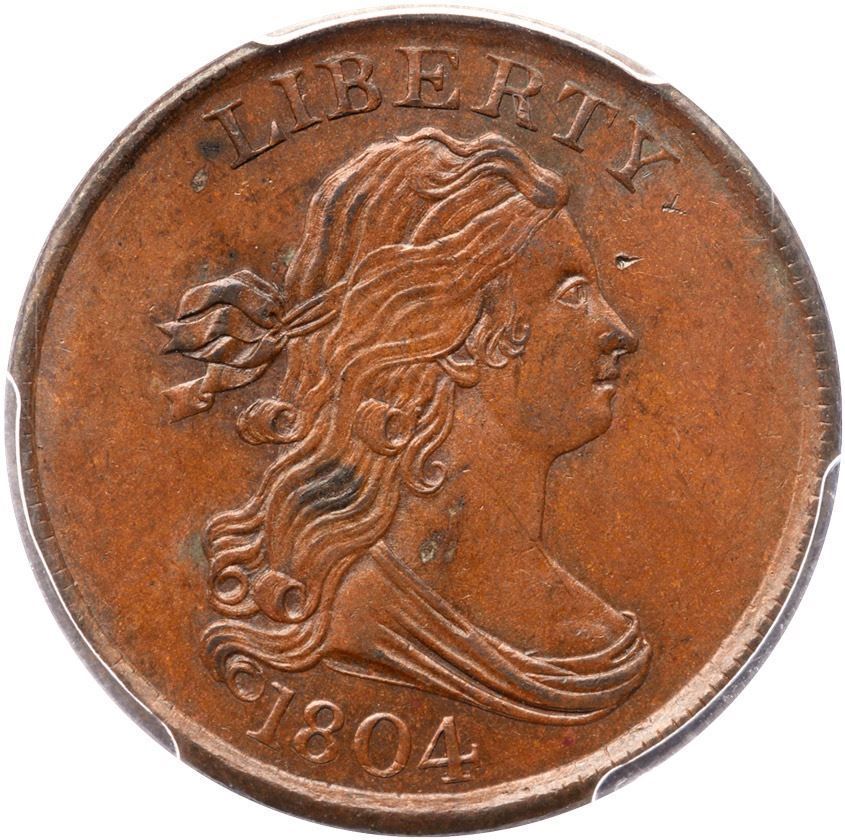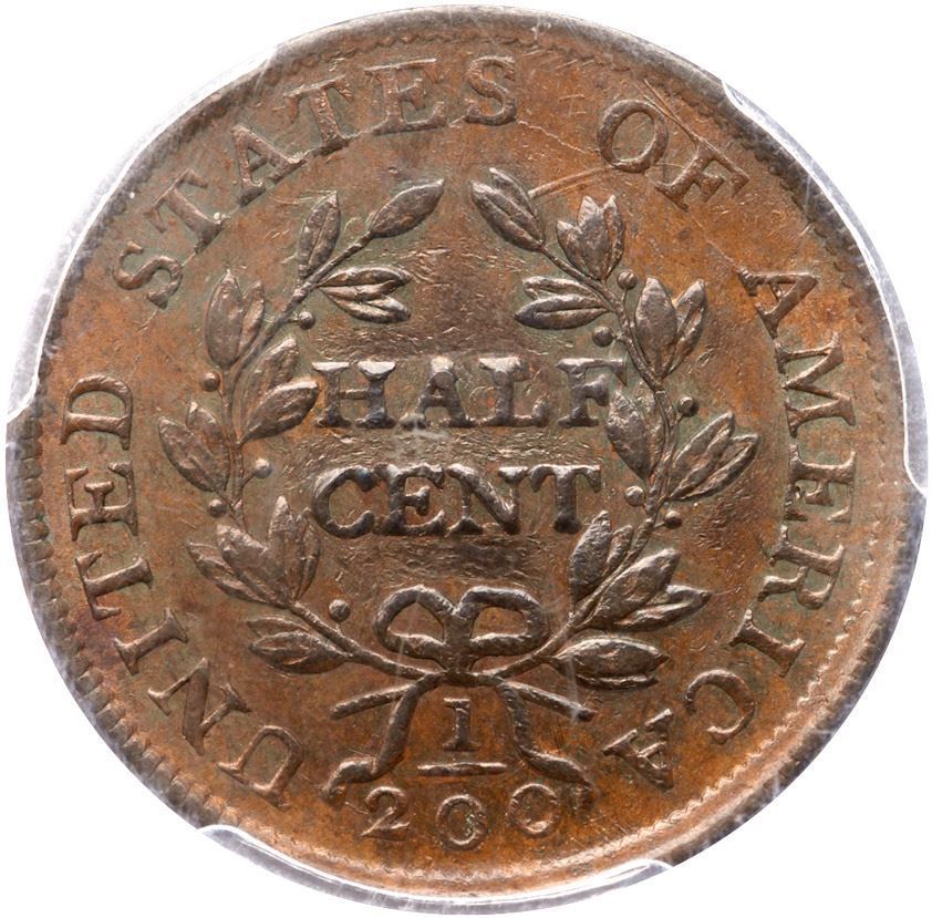 Mint state sharpness but there are three tiny planchet voids on the neck with darker planchet slag inside the voids, as struck. The only signs of contact are a pinprick in the field before the eyebrow, another right of the Y, and numerous small nicks inside the wreath around HALF CENT. Very attractive lustrous light steel brown with bluish steel overtones in the protected areas on the reverse. Our grade is MS sharpness net AU50, the deduction attributable mostly to the nicks inside the wreath. LDS, Manley state 3.0, with a fine die crack from the crosslet of the 4 through the bust tip. The reverse is rotated 10 degrees CCW. Not perfect but certainly one of the finest known of this rare variety. The attribution and Missouri Cabinet provenance are noted on the PCGS label. (The slab is badly scuffed on the reverse)