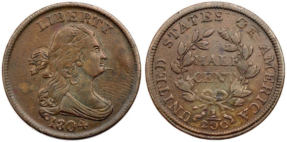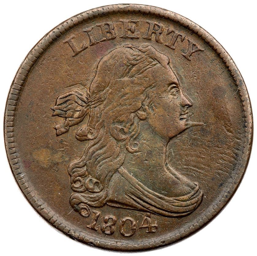 Slightly sharper but lightly cleaned and very nicely retoned glossy light olive and tan blending to light chocolate brown. Smooth and attractive showing only minor contact marks including a tiny rim nick over the A in STATES. Double struck over an obverse brockage strike. The first strike was an obverse brockage that was centered on the planchet. The second strike was centered on the planchet as well, but it was rotated about 5 degrees CCW relative to the first impression on the obverse. The doubling is clearly visible on the date and most of the portrait. In addition there is clear obverse brockage undertype showing on the reverse including an incuse 04 from the date at S-O and parts of LIBERTY at the fraction and ICA. A great mint error. EDS, Manley state 1.0. The "Spiked Chin" feature is obvious. Ex McCawley & Grellman Auctions 1/29/2012:66-McCawley & Grellman Auctions/Goldbergs 1/25/2015:119 (includes both lot tickets)
