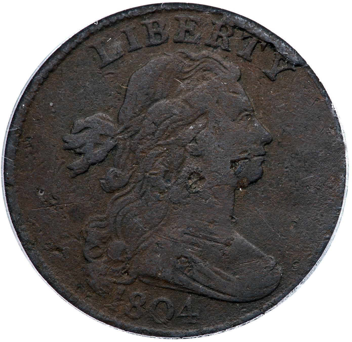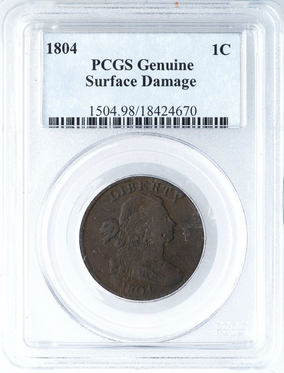 1804 S-266c R-2 PCGS Genuine (Surface Damage)VG10 sharpness but there is fine roughness on the surfaces and several nicks on Liberty's cheek, neck, and drapery. Dark brown and steel patina. A bit weaker but readable at UNITED STATES, the remaining legends and date are strong. Our grade is G5.Certificate Number: Certificate # 1504.98/18424670