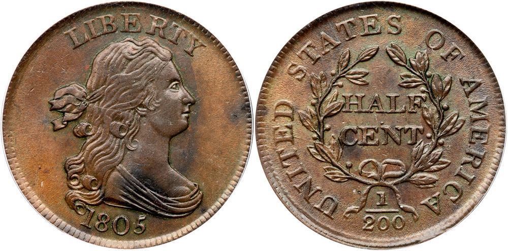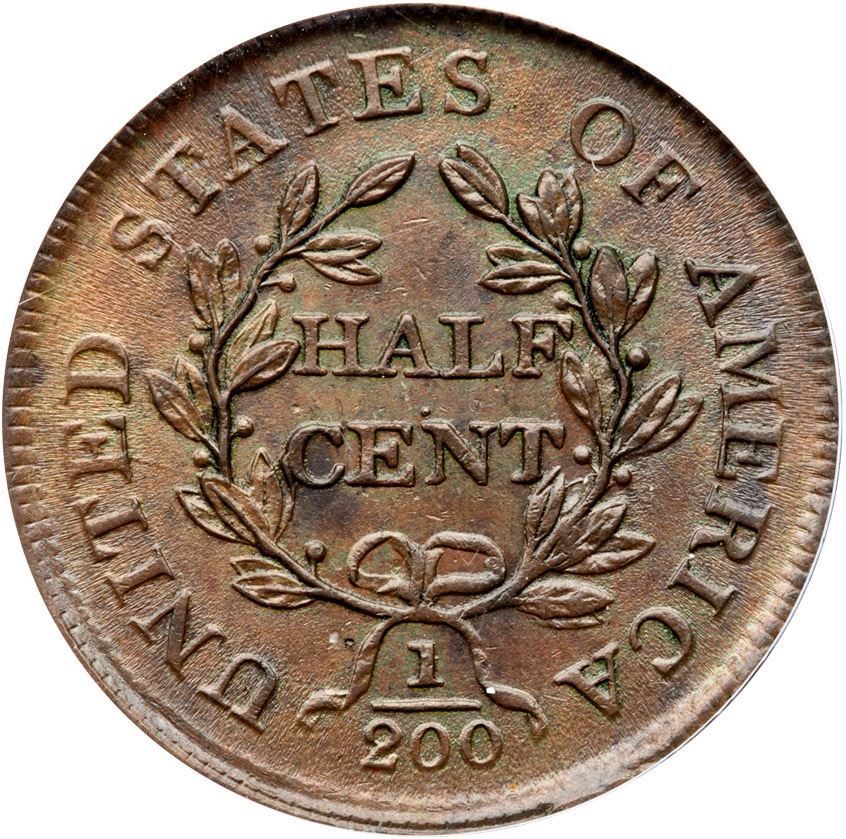 Lustrous light greenish olive with puffs of olive brown. Frosty and very attractive. The notable marks are an area of darker olive brown toning near the dentils before the mouth and a spot of similar toning at the C in CENT. Both sides are covered with a very thin layer of "Care" or a similar protectant. MDS with lightly flowlined fields and small rim cuds on the reverse, the largest one off the right end of the wreath ribbon. The repunching at the top of the 5 is sharp. This is the Breen plate coin for his die state III in the 1983 half cent encyclopedia (see page 260). Our grade is MS60+. Housed in an older generation PCGS slab.