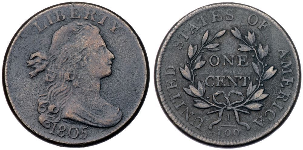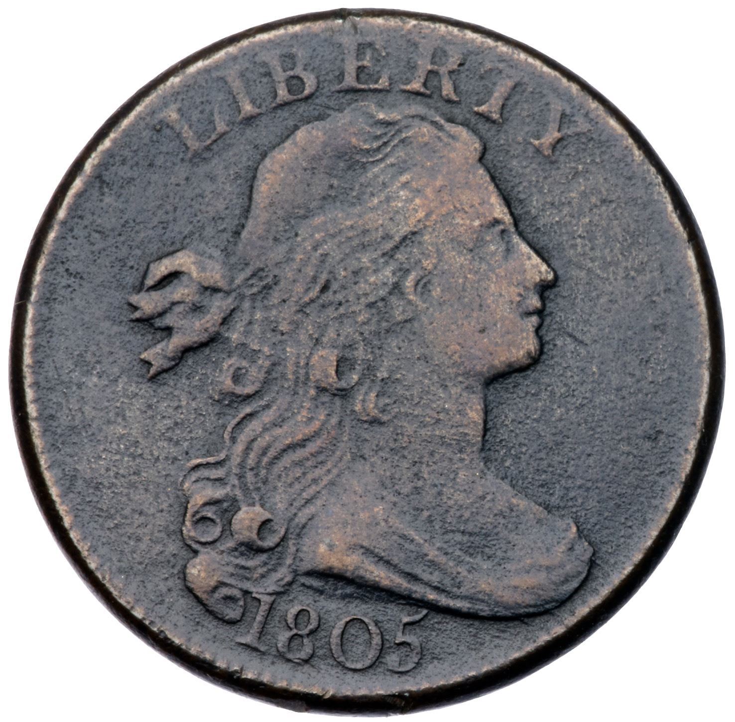 1805 S-269 R-1 VG10VF20 sharpness but fine granularity covers the surfaces. The obverse is rather glossy dark steel with lighter brown on the highest points, while the reverse is dark olive with light brown on the high points. Free of notable marks. E-MDS, Breen state II.Certificate Number: