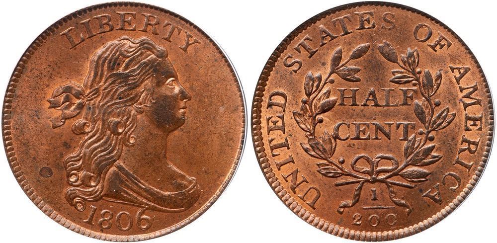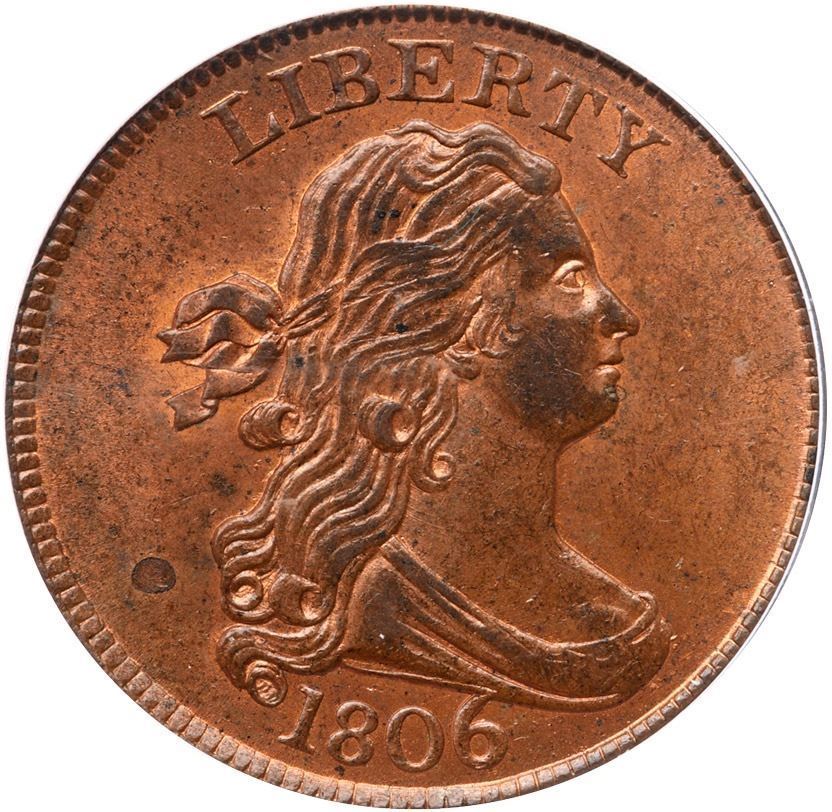 Lustrous mint red fading to steel brown with at least half of the planchet showing mint color, mostly on the reverse. The only marks are some tiny specks of darker toning scattered over both sides and a larger spot of toning (not carbon) left of the lower curls. Nicely struck E-MDS, Manley state 1.0. The repunching on the 6 is clear and the reverse is rotated 25 degrees clockwise. Our grade is MS64. This is the Breen plate coin for the variety (page 276) and is on the special color plate on page 506 in the back of his 1983 half cent encyclopedia. Housed in an older generation PCGS slab.