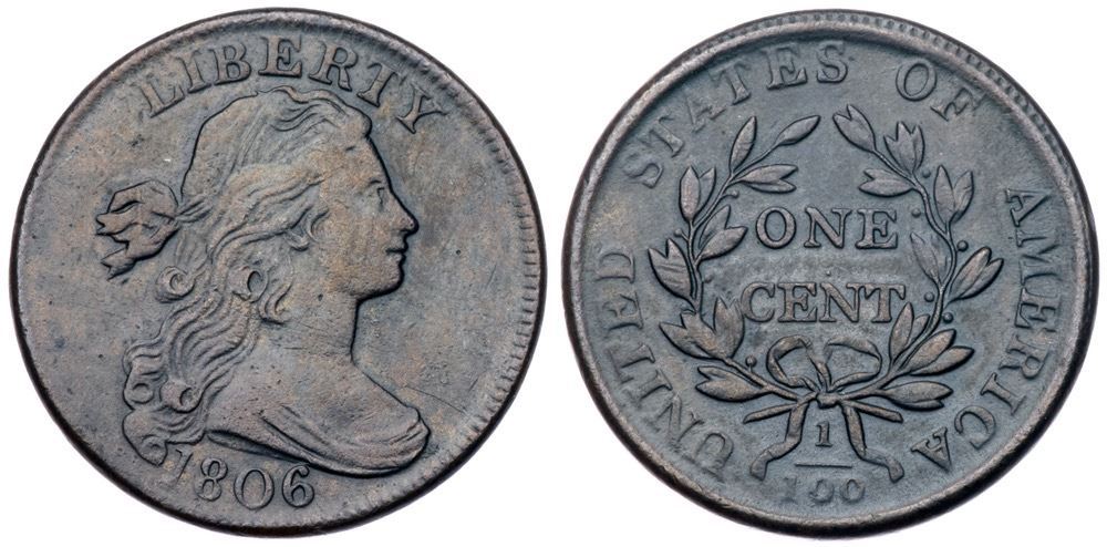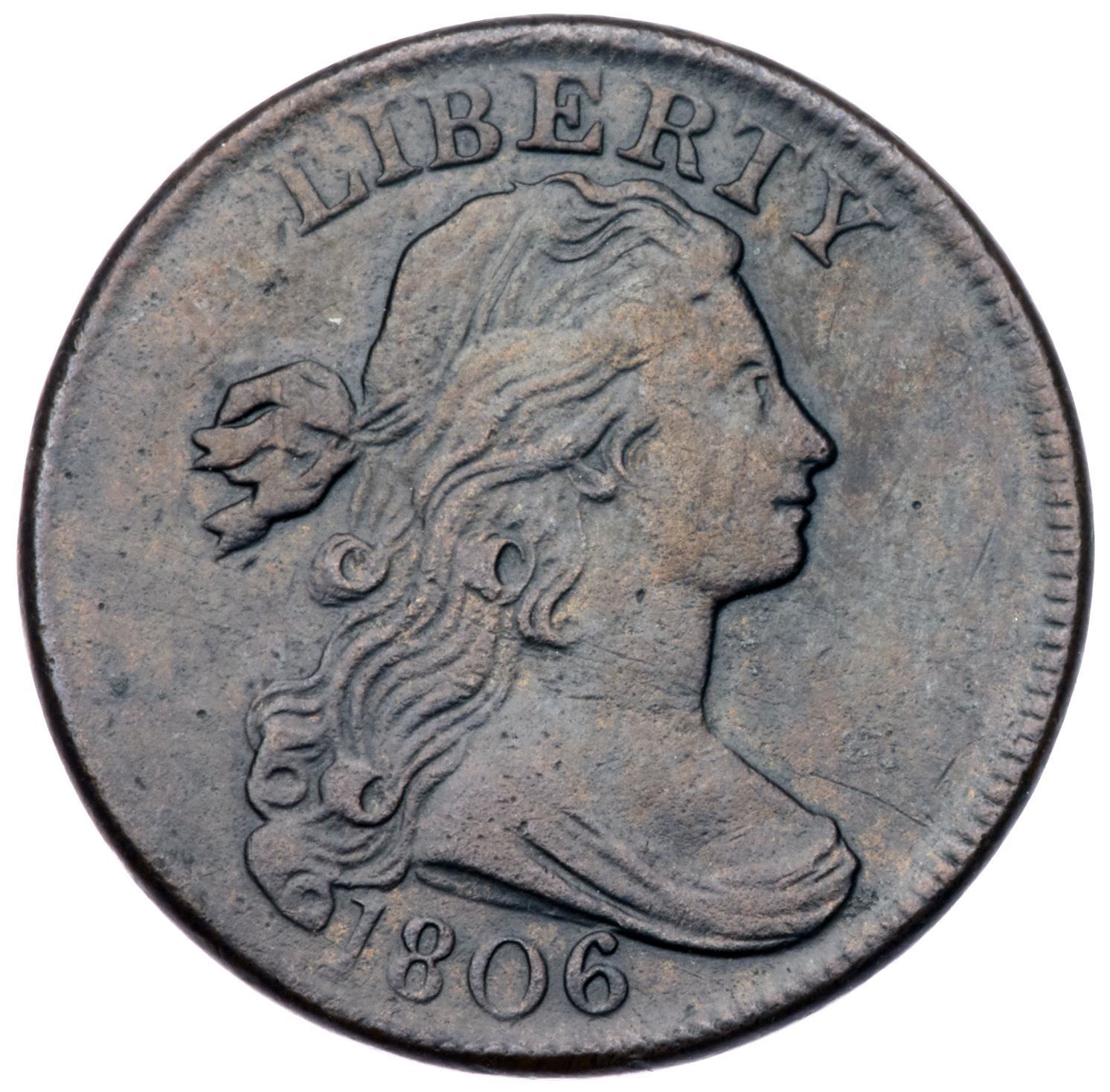 1806 S-270 R-1 VF20+VF35 sharpness but there are light scratches on the portrait and fields and very faint microgranuliarty in some protected areas visible under a glass. Otherwise smooth to the unaided eye with mottled dark chocolate brown and steel brown surfaces. MDS.Certificate Number:
