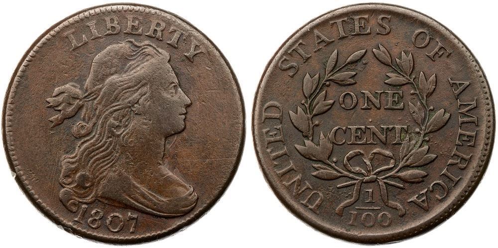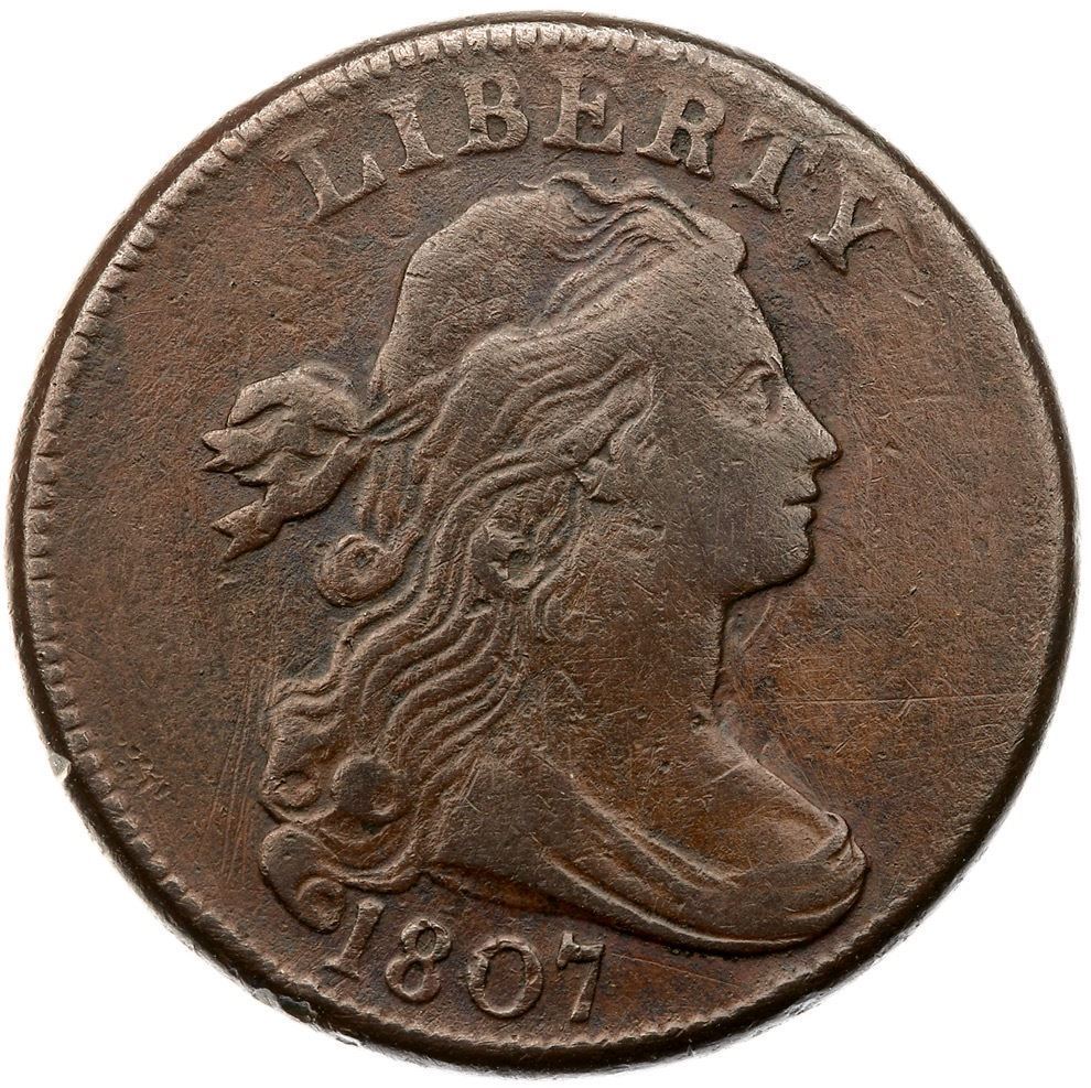 At least five points sharper but there are myriad fine hairline scratches on the obverse, strongest just left of the lower curls. There are a few traces of verdigris in protected areas on the reverse. Otherwise quite nice and the eye appeal is excellent. Glossy brown and light chocolate with some reddish chocolate in protected areas. MDS with die clashmarks from the chin to the bust.