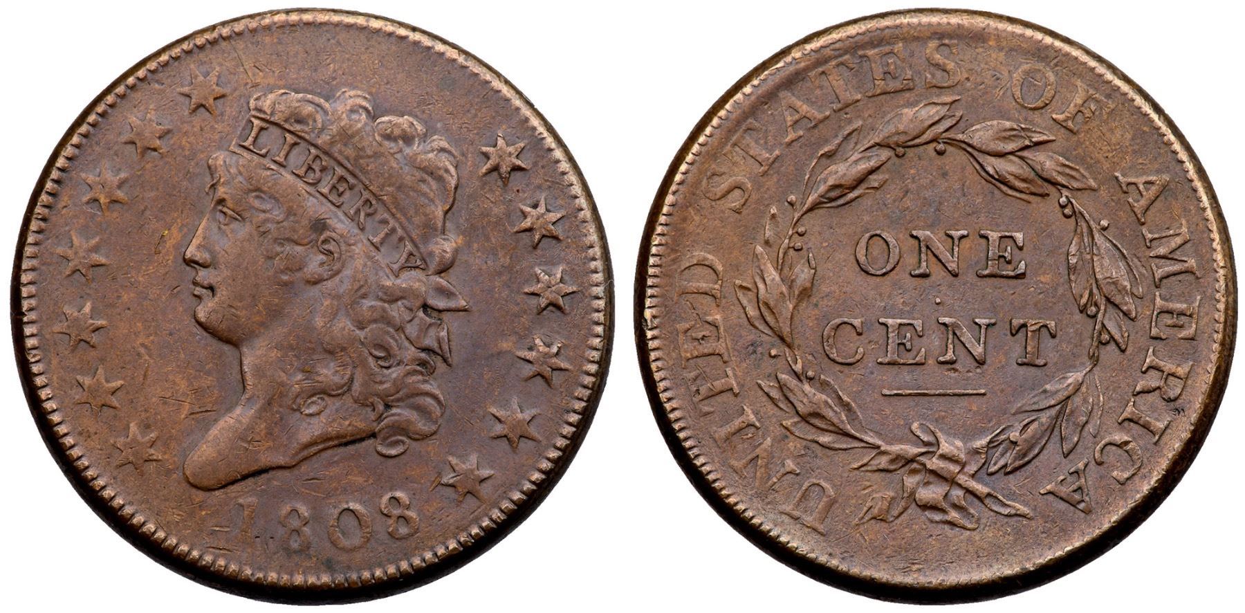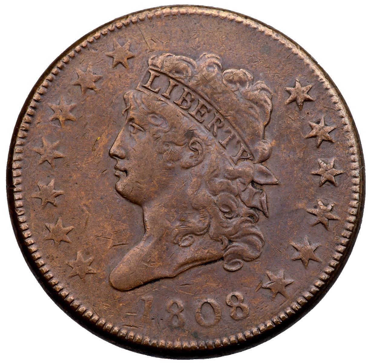 1808 S-277 R-2 F15VF sharpness but lightly cleaned long ago and now glossy tan and chocolate browns. There are trivial nicks in the fields, including one before the nose and another above the bust tip. Smooth surfaces. Certificate Number: Pedigree: Ex; eBay - Willam Schwartz