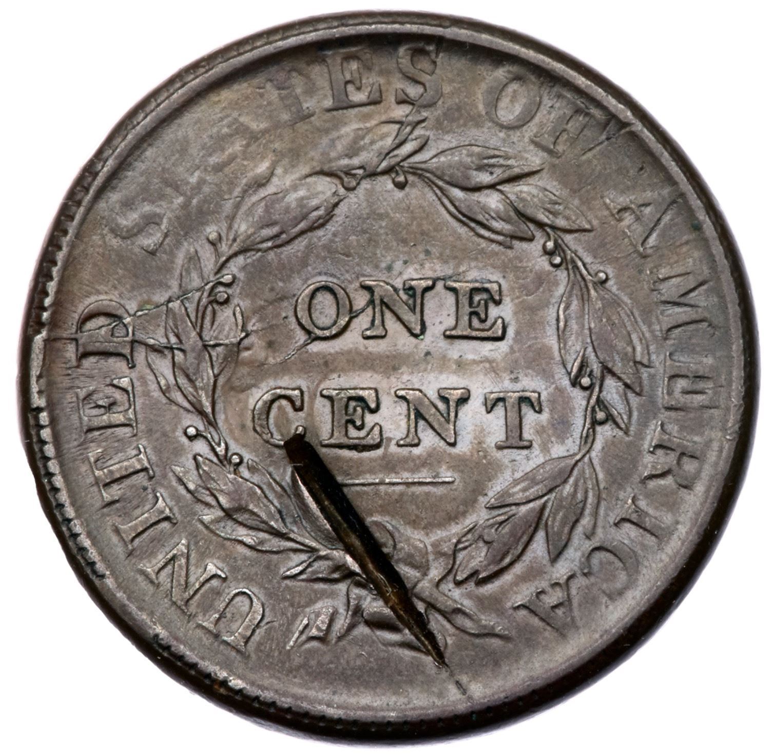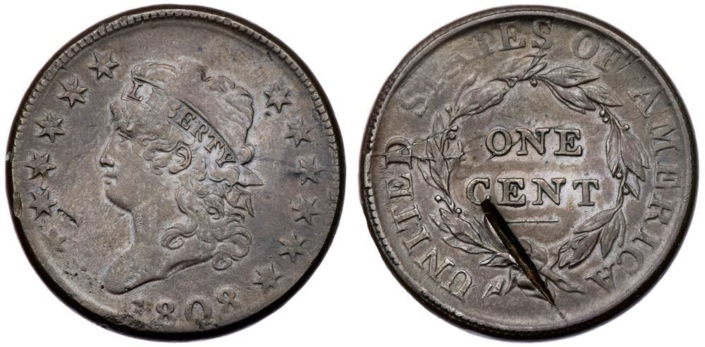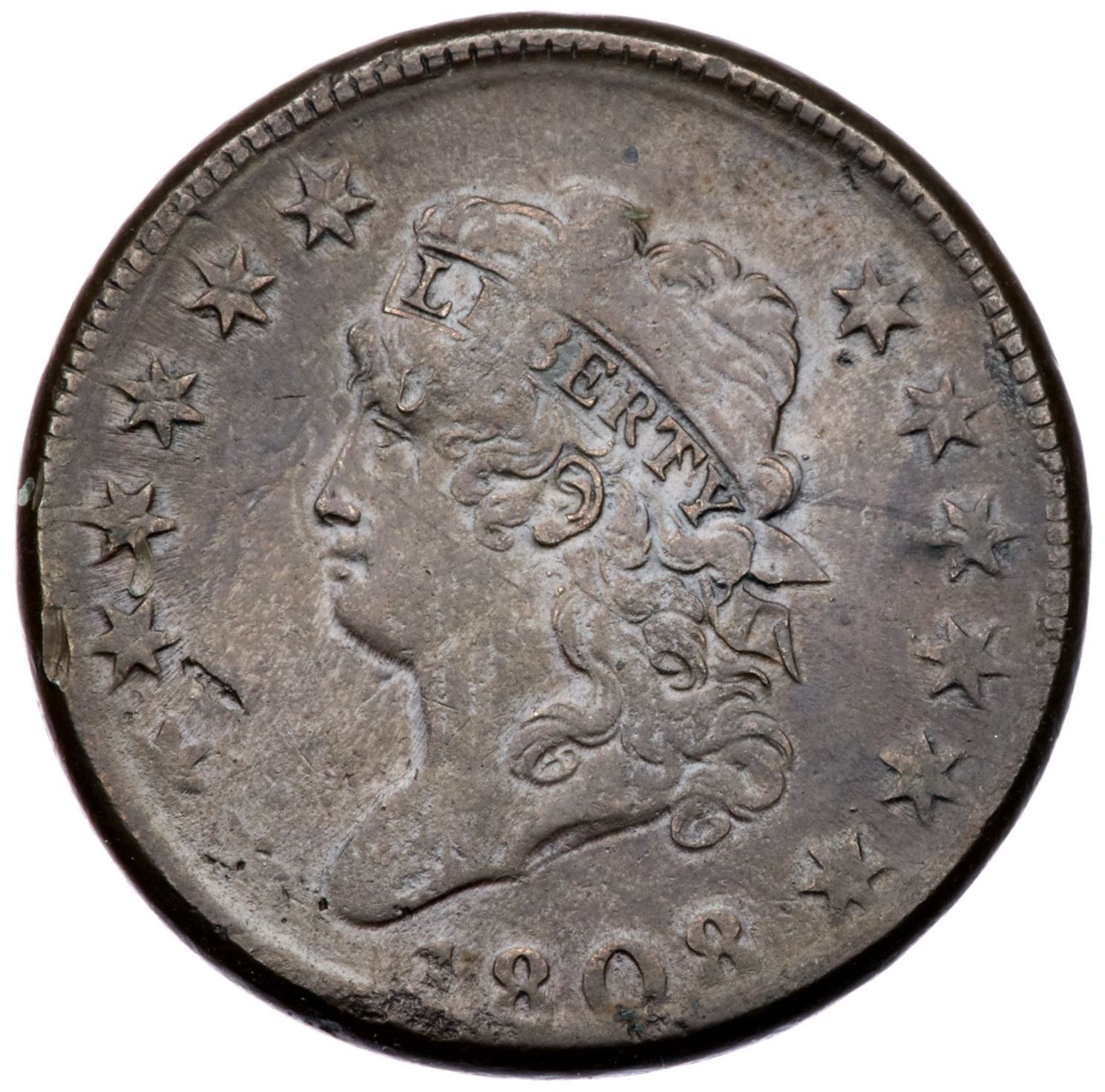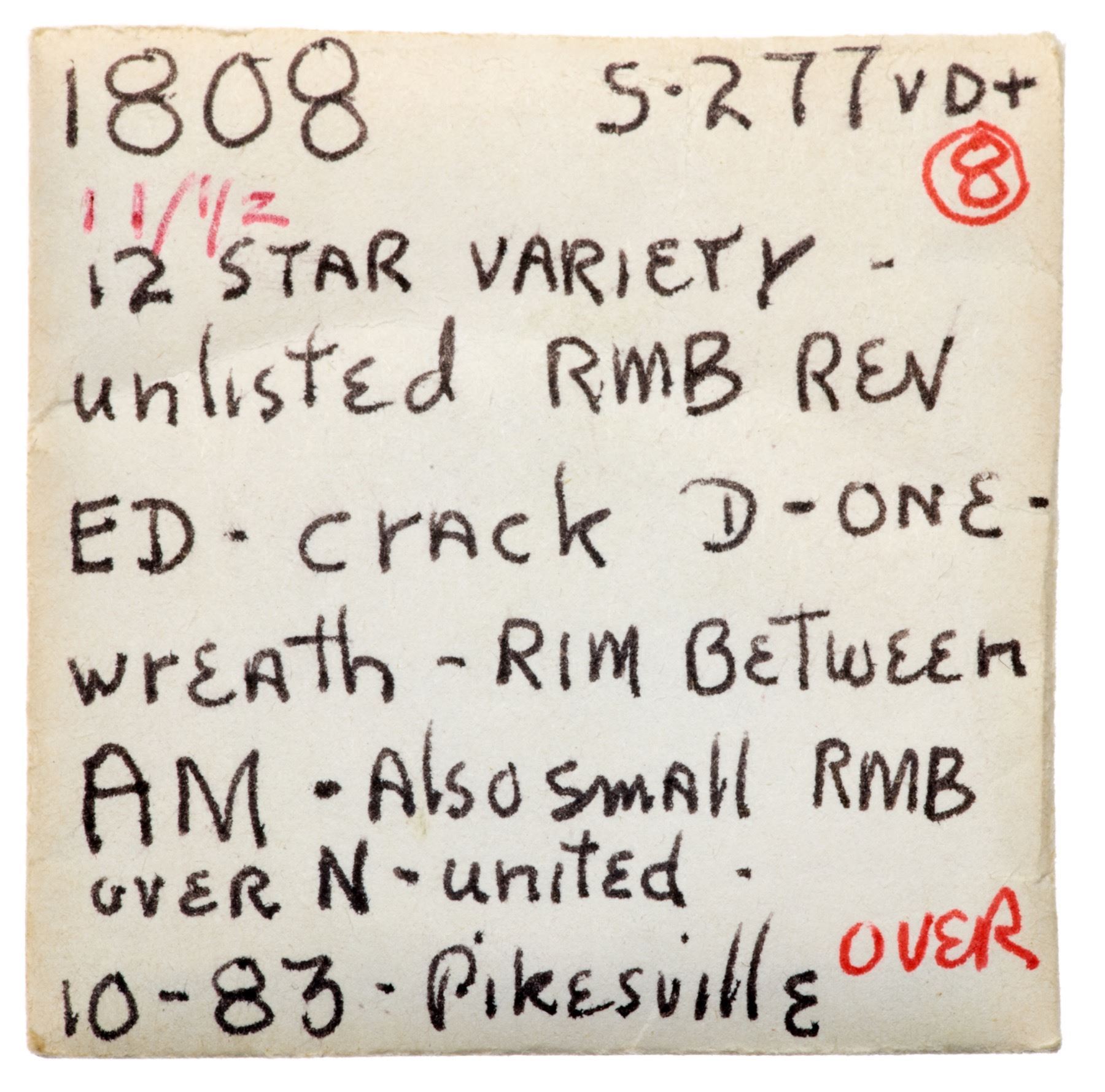 1808 S-277 R-2 G6VF35 sharpness but there is a deep dent under C in CENT down through the ribbon. The other notable marks are a couple nicks at star 2 and on the rim under the date. Mottled medium olive and steel browns on smooth, glossy surfaces.V-LDS, Breen state IX.Certificate Number: