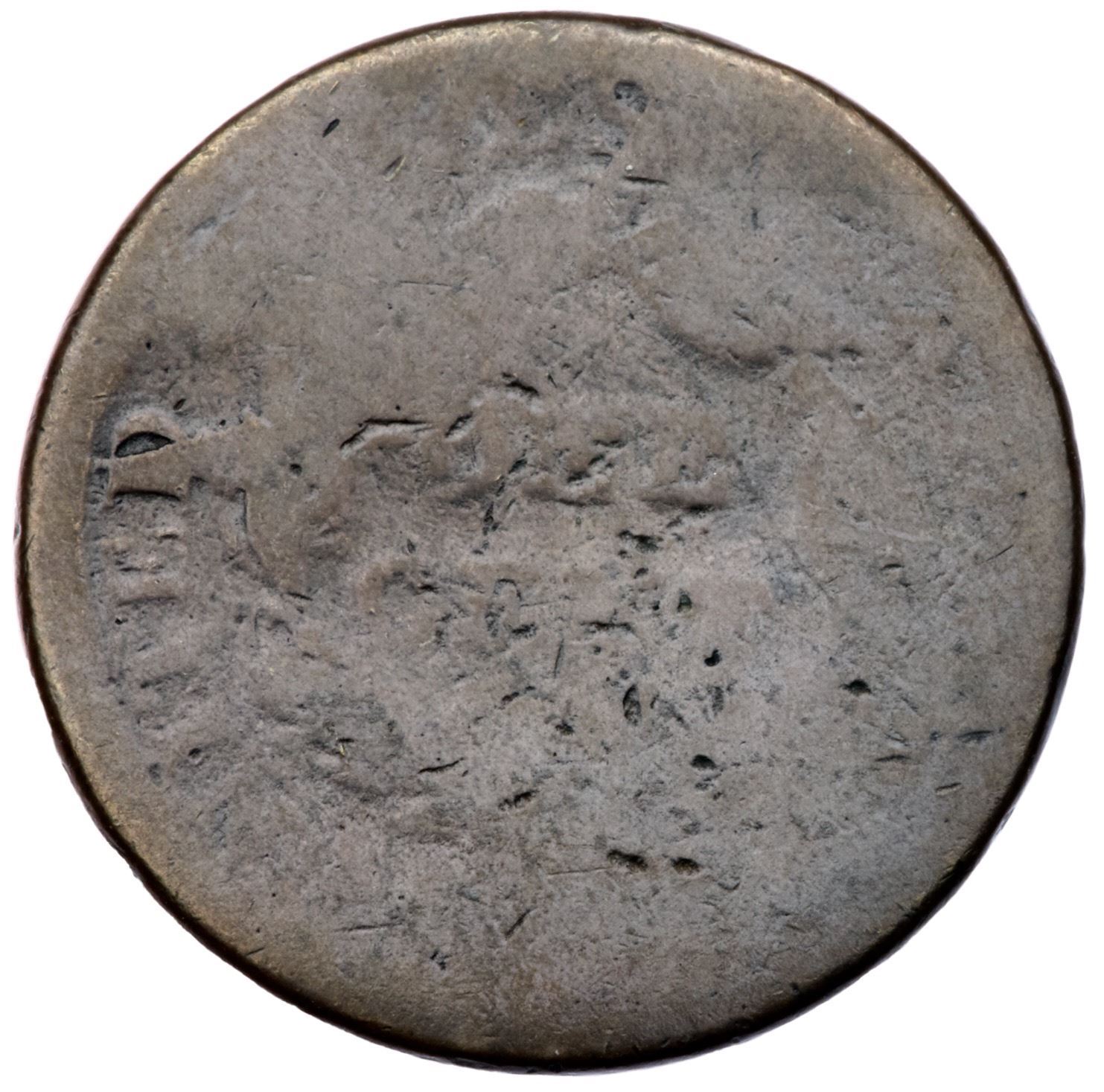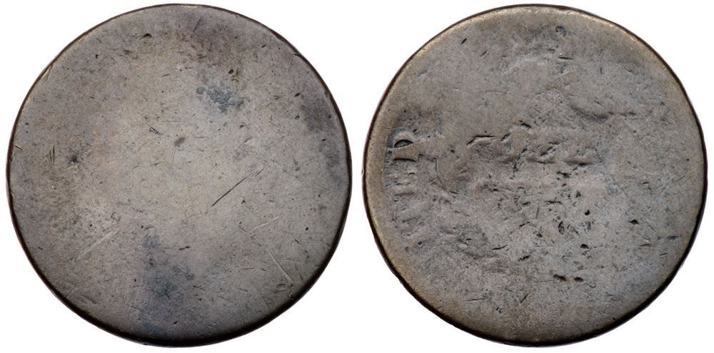 1808 S-277 R-2 P1A "choice" Basal state with only the faintest outline of the portrait, readable ONE CENT, NITED, and TES. Despite this the VLDS with the string die break through D in UNITED up through the wreath to the last S in STATES is visible. Glossy, medium olive brown surfaces. Certificate Number:
