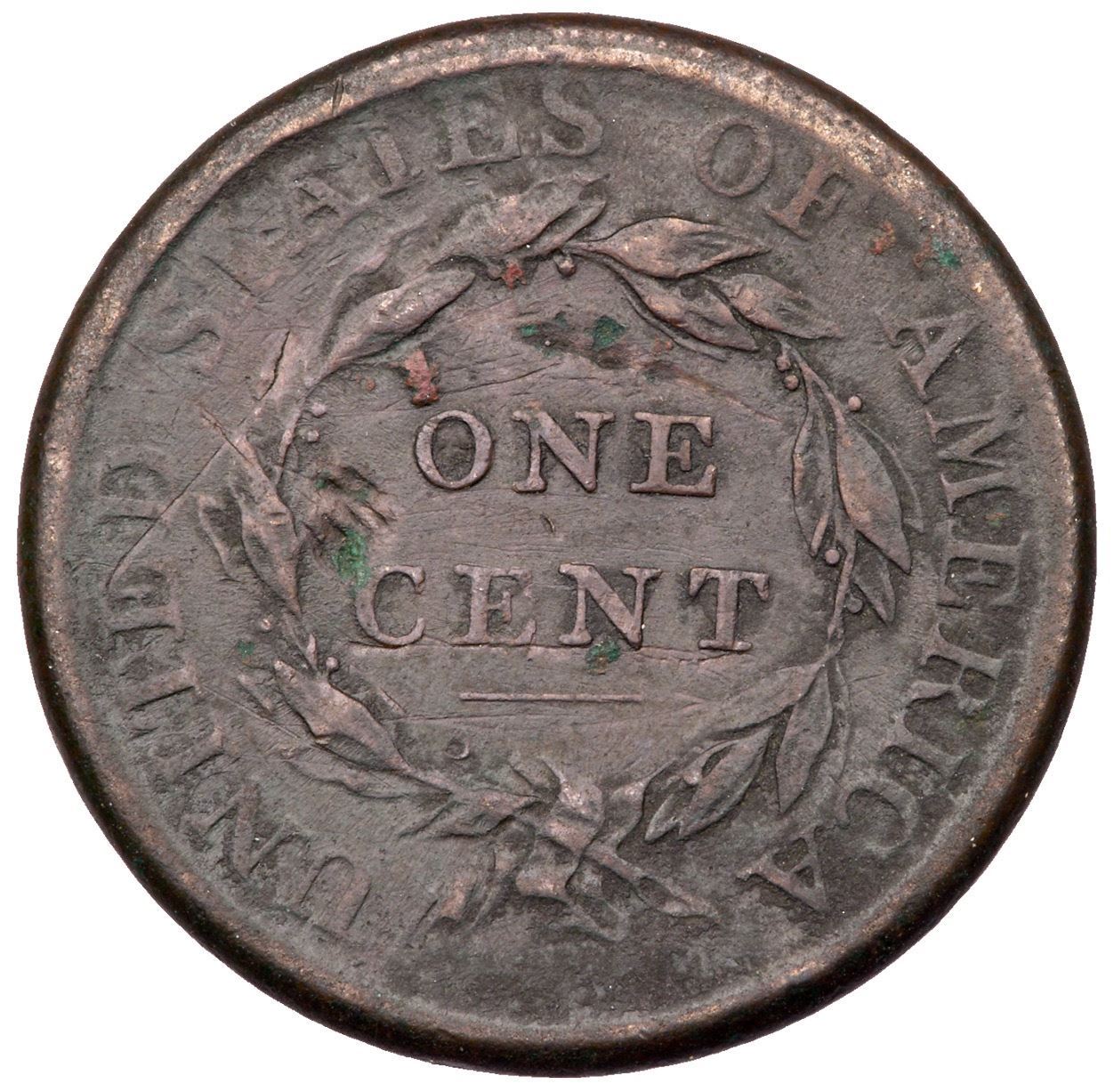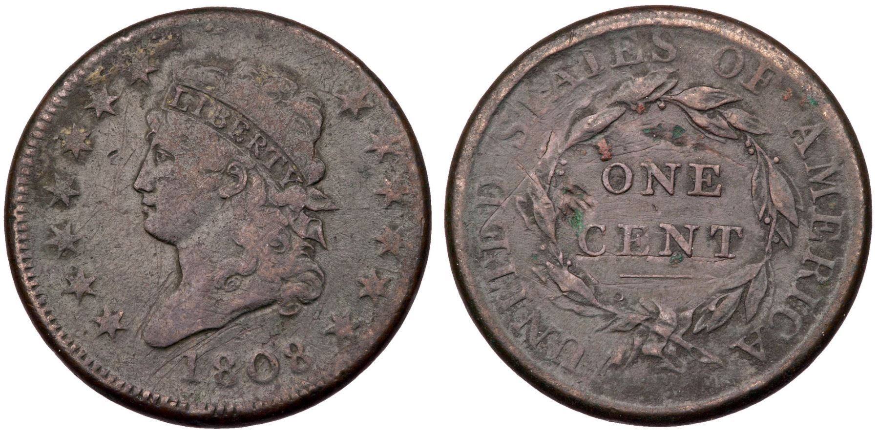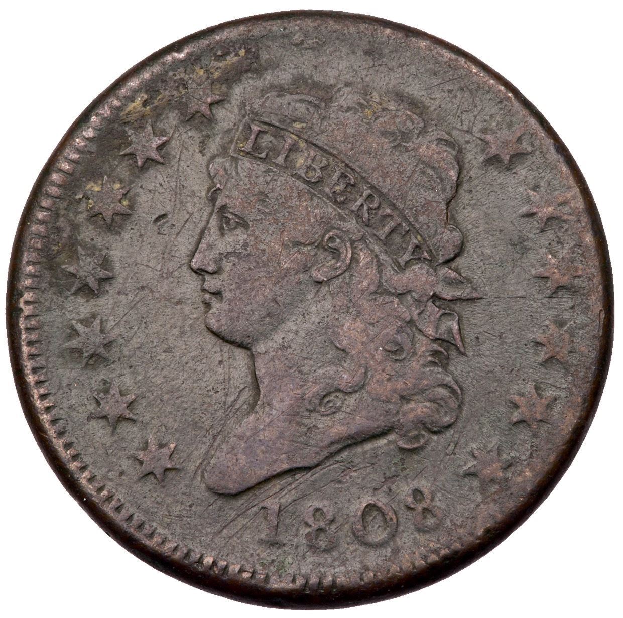 1808 S-278 R-3 VG7F15 sharpness but corroded with fine roughness and verdigris on the surfaces, and old scratches on both sides. There are also a couple notable digs above ONE and C in CENT. Mostly dark olive brown with lighter brown on some high points. Bold date and legends.Certificate Number: Pedigree: Ex; Phil Hyde