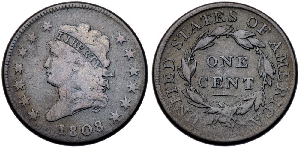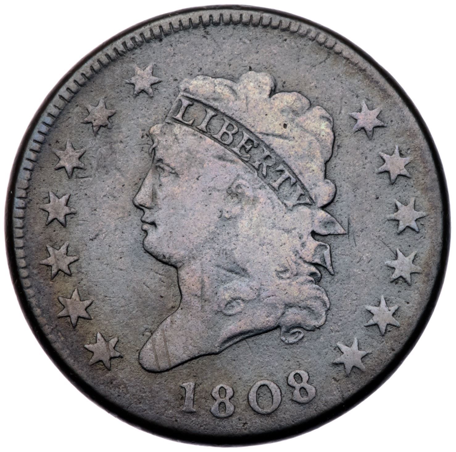 1808 S-279 R-1 VG8Deep charcoal patina, a few shades lighter on the devices and legends. There are a few minor nicks and pin scratches on the portrait and fields, no marks on the reverse. Semi-glossy surfaces. EDS.Certificate Number: