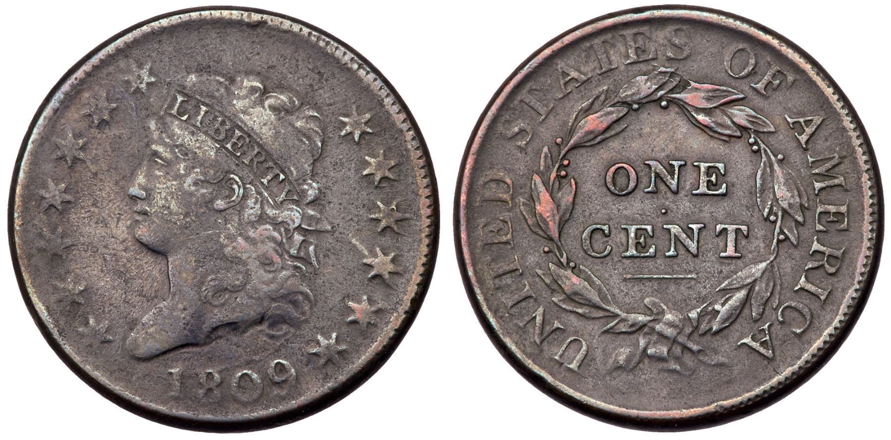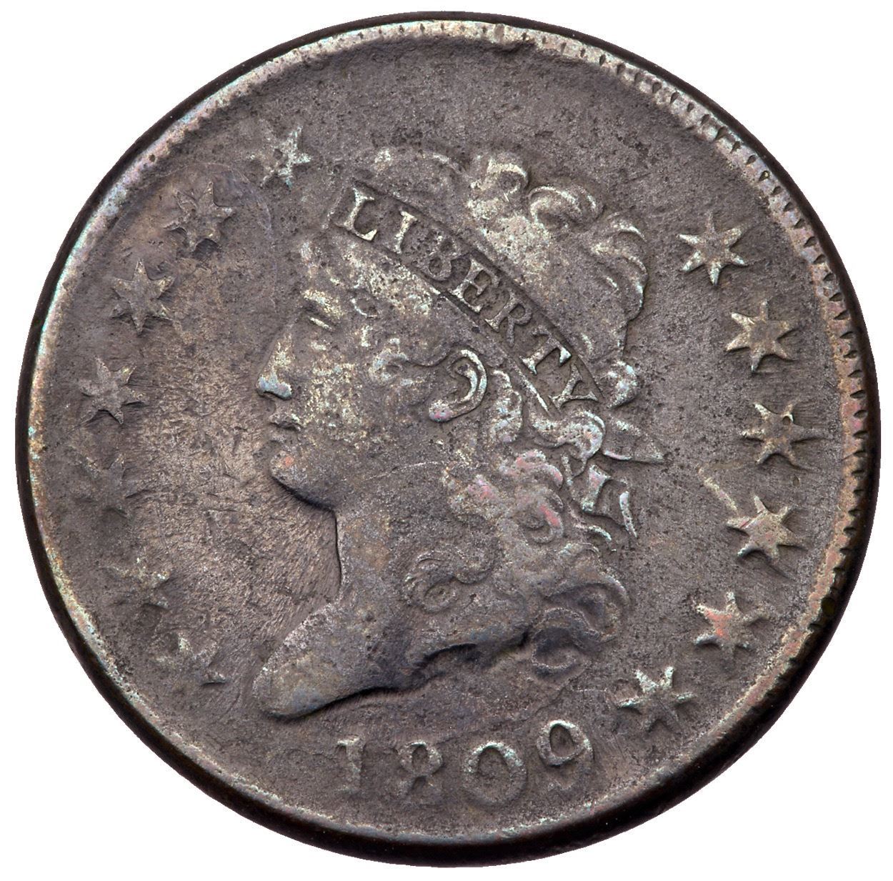 1809 S-280 R-2 VG10VF25 sharpness but dark with a deep stain on the obverse and fine granularity on the surfaces. Otherwise deep steel with peeps of artificial red on the highest points. MDs, Breen state V.Certificate Number: Pedigree: Ex; Phil Hyde