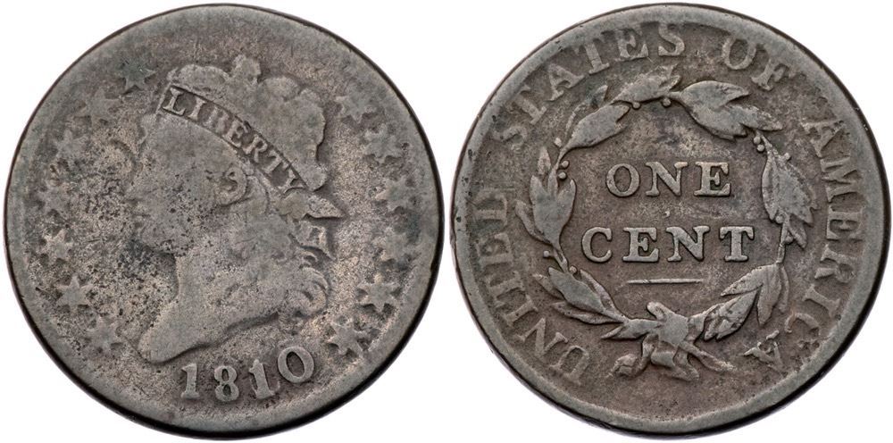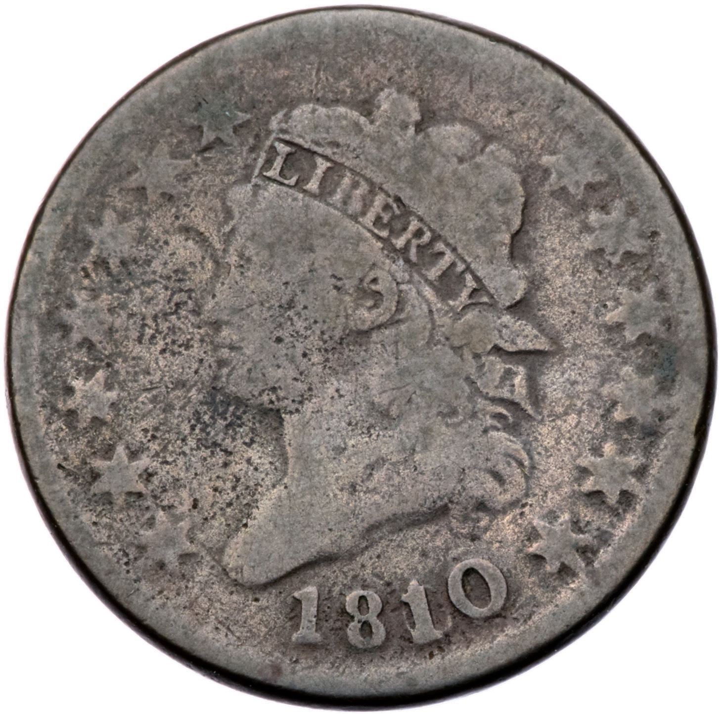 1810/09 S-281 R-1 G5Olive and chocolate browns with microporosity scattered lightly on LIberty's face and left obverse field. There is also a dull nick in front of the nose bridge. Otherwise fairly smooth surfaces, bold date and legends with clear overdate feature. LDS.Certificate Number: