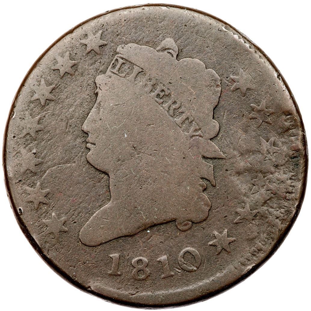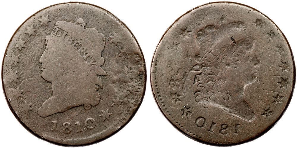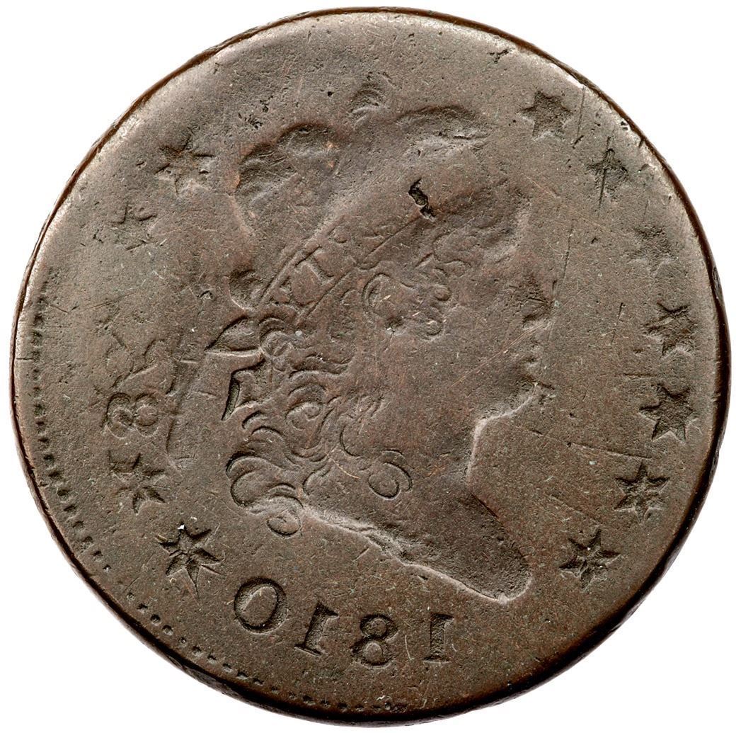A centered obverse brockage strike without any rotation between the normal and the incuse impressions. A couple points sharper but it was smashed at the stars behind the portrait while another cent dated 1852 was against the reverse. The incuse 1852 date is visible but the 2 is faint. This was damage, not another mint error. Early mint errors often suffered abuse such as this. Otherwise the surfaces are smooth and the toning is an attractive glossy medium chocolate brown. Both the normal and incuse 1810 dates are strong.