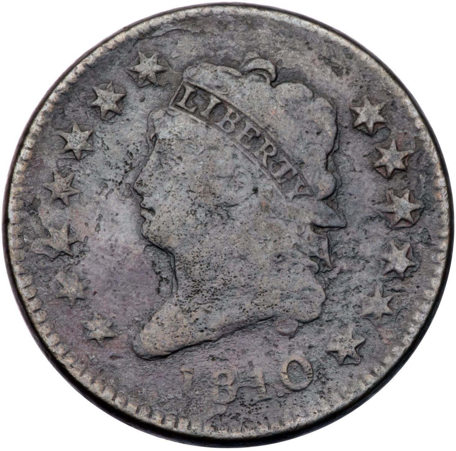 1810 S-285 R-2 VG7F12 sharpness but the surfaces are corroded with deep maroon area left behind from shallow scale, most notable on the lower and left obverse fields. Otherwise dark brown and olive brown surfaces. Strong date and legends.Certificate Number: