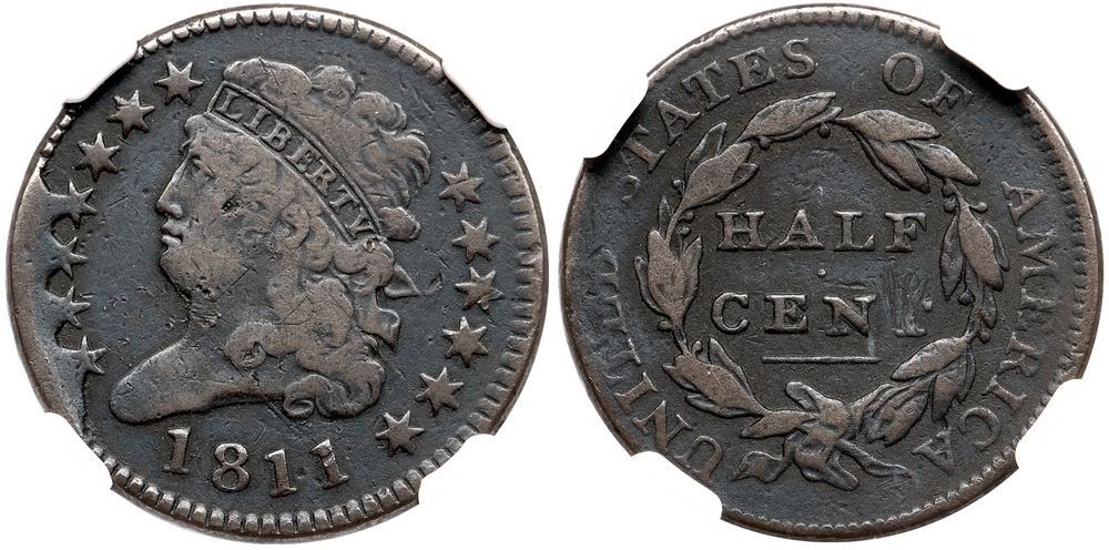 Slightly glossy dark steel brown and olive with lighter chocolate on the devices. Looks smooth but a glass reveals extremely faint roughness in the fields and protected areas. No verdigris but there are some marks. A collection of ticks at the throat, another high on the cheek, and some intentional scratches that nearly erased the T in CENT are the notable marks. LDS, Manley state 5.0, with a large cud break connecting stars 1-4 to the rim. The date is bold and the legends are clear except for weakness at TED-S due to the opposing cud that consumed too much of the available planchet. Our grade is F15 sharpness net VG8. The attribution is noted on the NGC label. 6703127-006