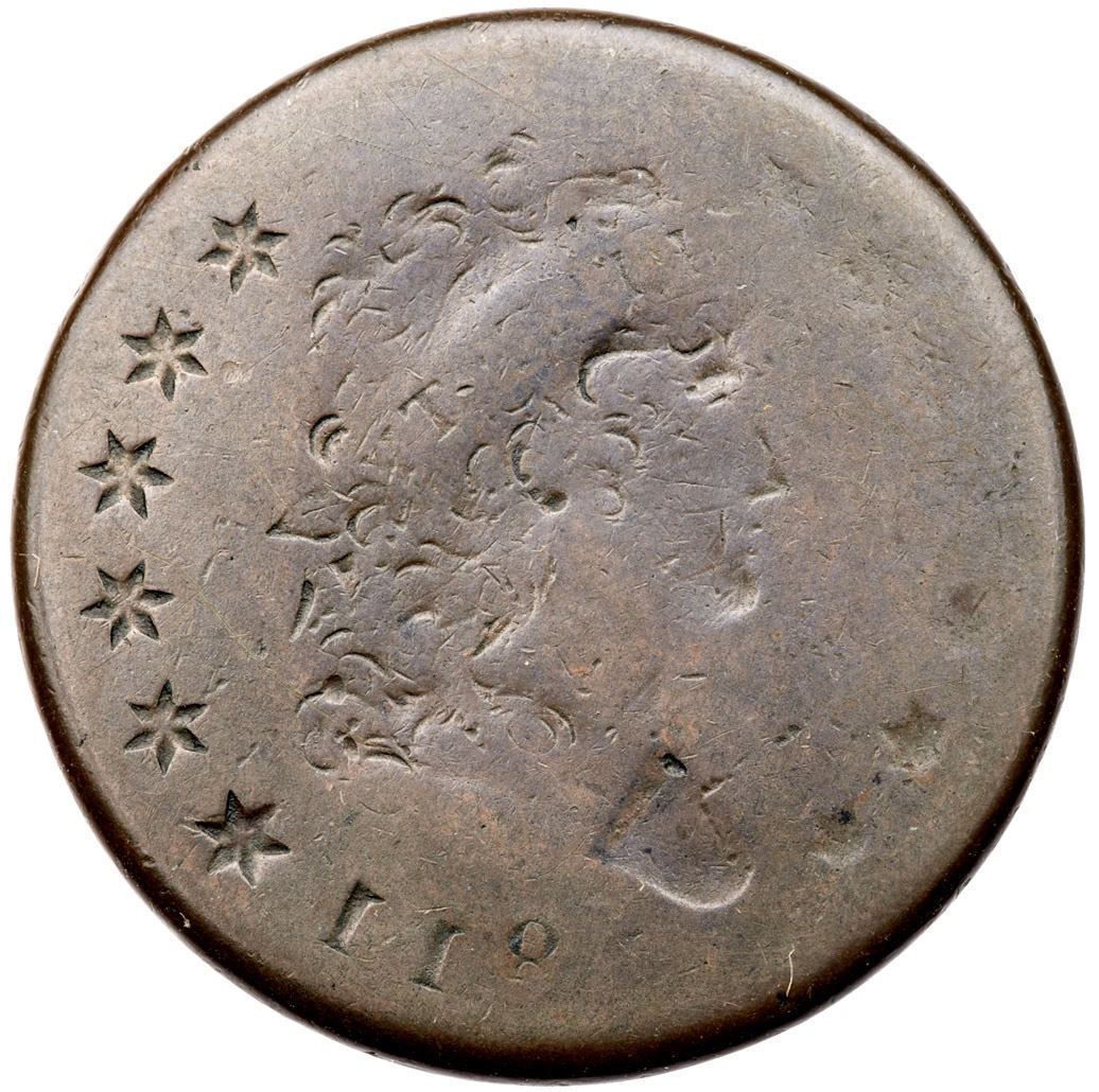 Glossy chocolate brown. Smooth and the only mark is a light scratch off the incuse curls. Basically just a well worn cent. There is a very slight rotation between the normal and incuse impressions. The normal date is clear but the incuse date is incomplete. Later die state.
