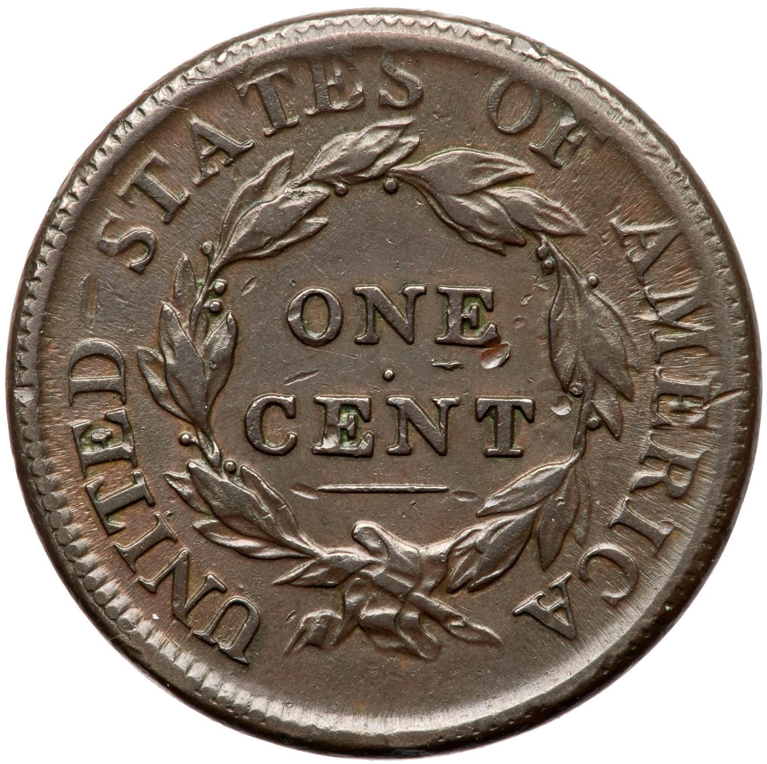 Five points sharper but there are several nicks on the reverse, the notable ones being a vertical one right of the D in UNITED and a dull one at the right bottom of the E in CENT. No roughness or verdigris. Glossy chocolate brown and steel. LDS, Breen state IV, with a die crack through most of the date and stars and die clashmarks on the reverse.