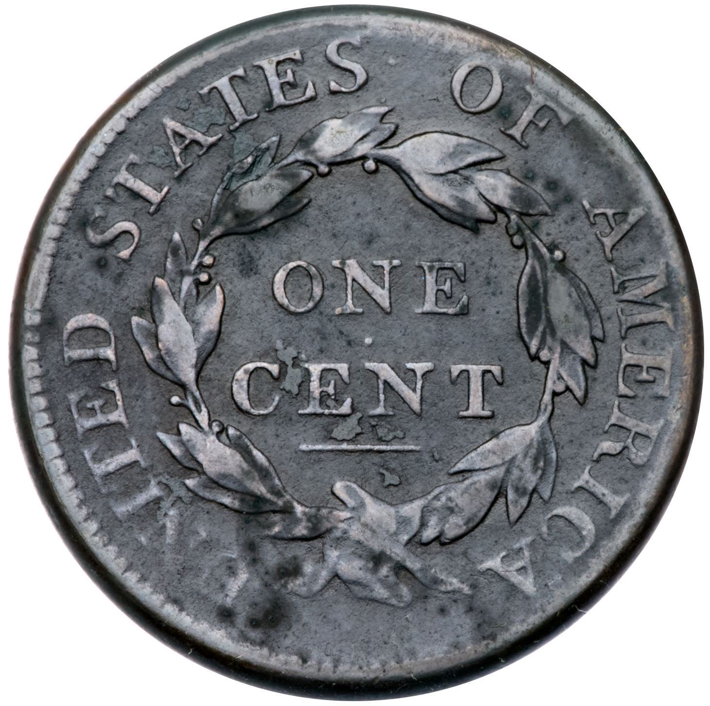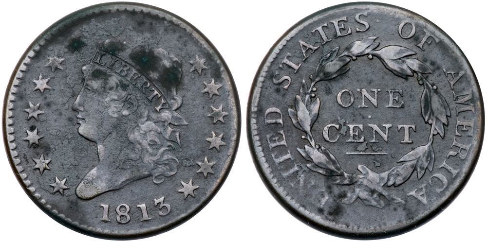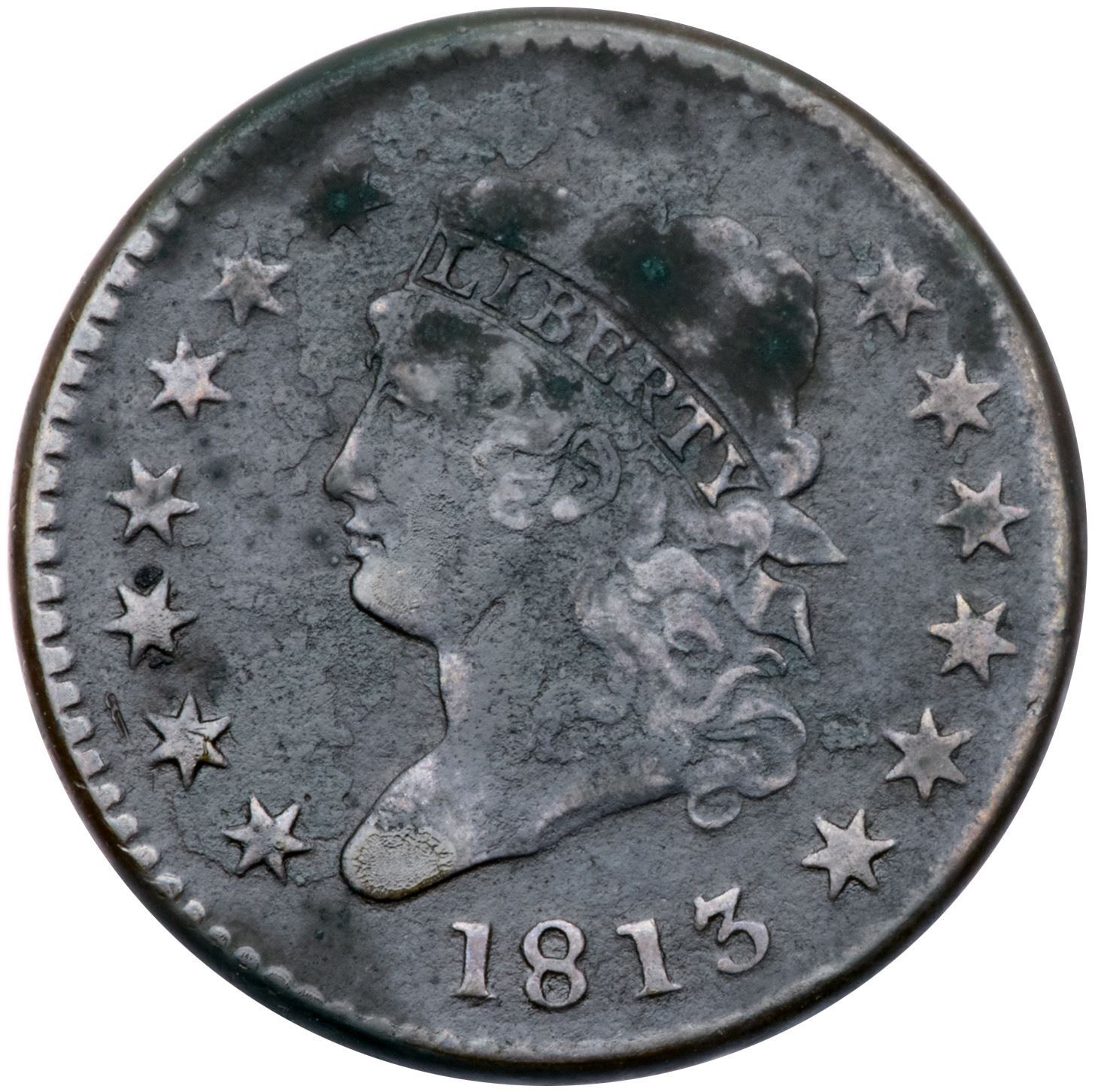 1813 S-293 R-2 VG7VG10+ sharpness but lightly corroded with fine roughness and areas of grainy, dark jade scale on either side. Otherwise dark brown surfaces, a couple shades lighter on some of the high points. Strong date and legends.Certificate Number: