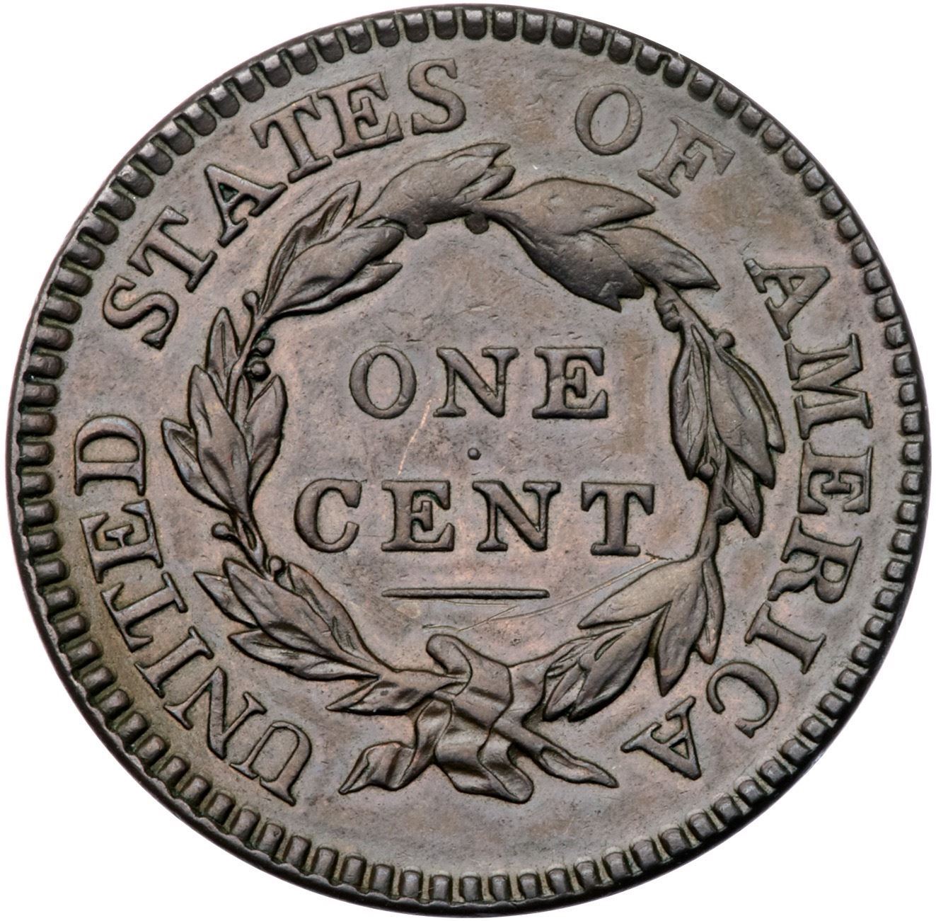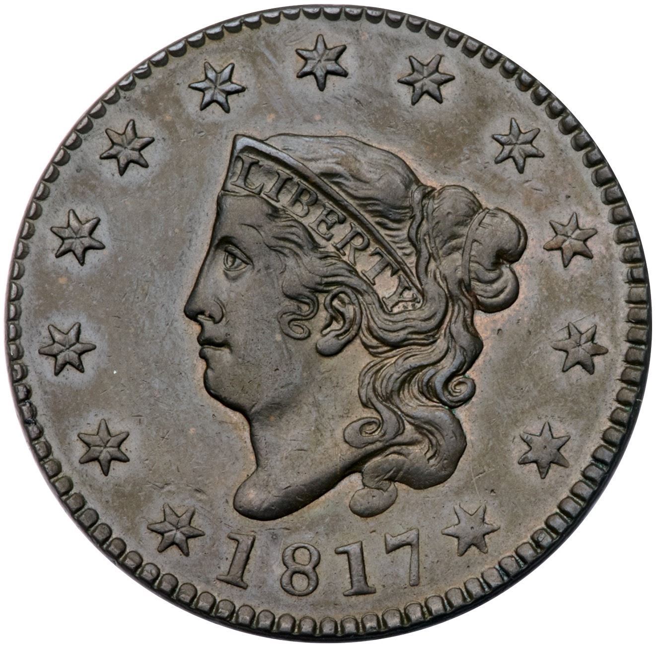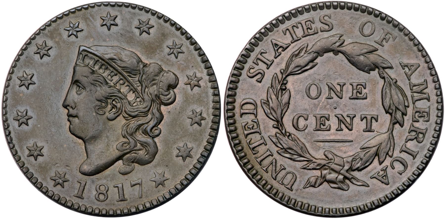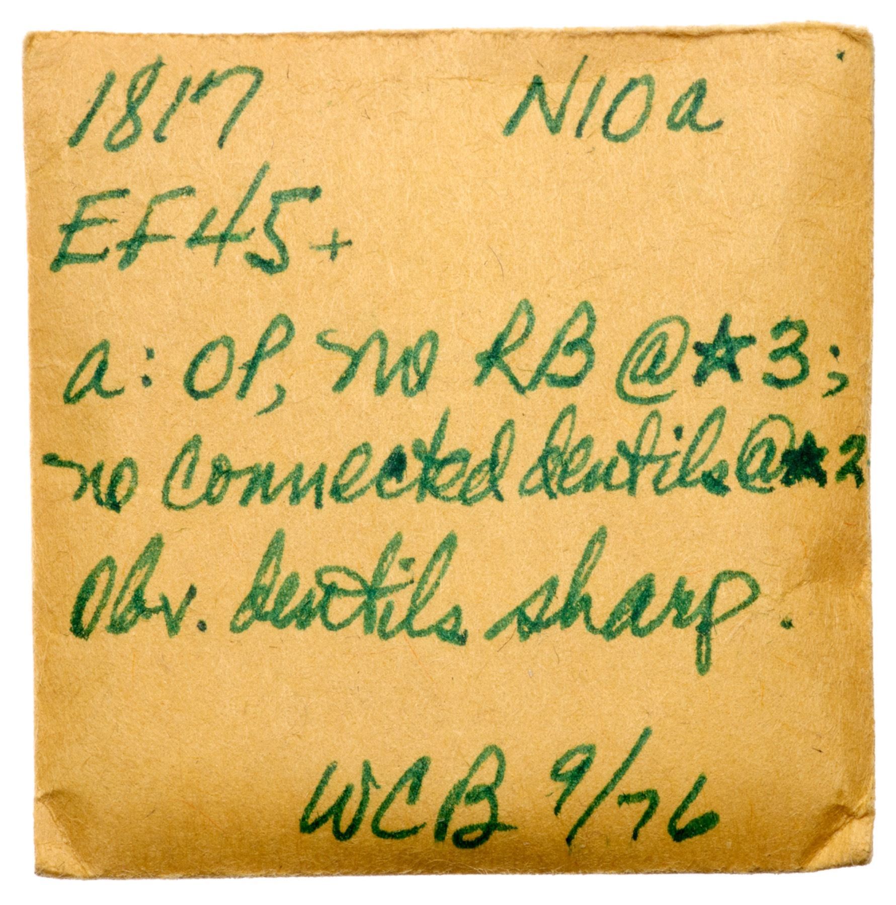 1817 N-10 R1 EF40A sharp, attractive cent with the details of a slightly higher grade, but there are a couple light scratches under the line below CENT. Otherwise just trivial marks. Glossy chocolate and olive brown with frosty lighter brown in some of the protected areas. EDS, die state a, with sharp dentils on both sides and a sharp diagonal line through the upper left point of star 11. Comes with a nice provenance.Certificate Number: Pedigree: Ex Willard C. Blaisdell 9/1976-R. E. (Ted) Naftzger, Jr.-Fred H. Borcherdt Collection (includes the Naftzger collection envelope)