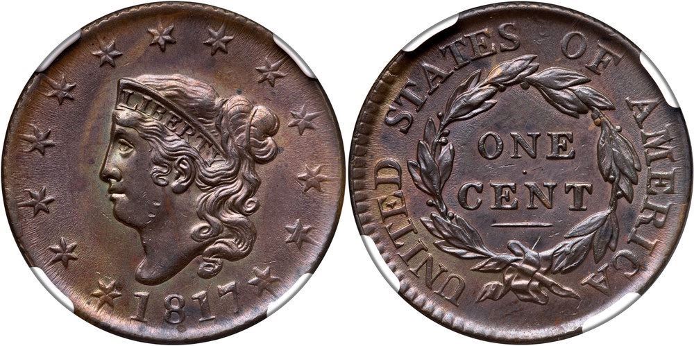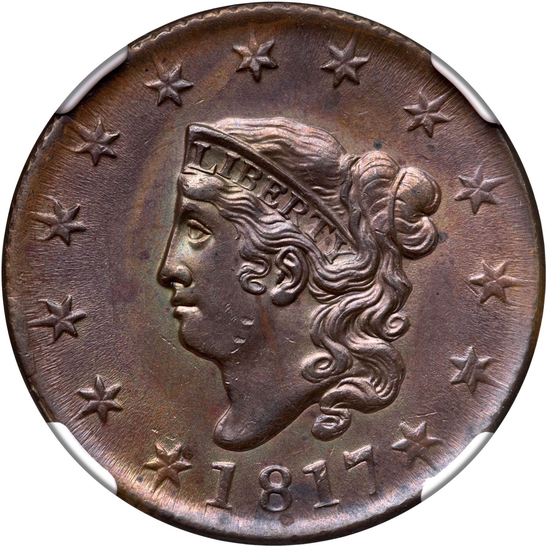 Lustrous tan and steel with a hint of light bluish steel overtone and subtle hints of underlying very faded red on the reverse. Possibly dipped long ago and retoned. Looks mint state but there are two dull nicks on the jaw and a couple other light contact marks in the field before the portrait plus a spot of slightly darker toning in the field before the upper lip. Scarce LDS with a clearly defined rim cud at star 3 in addition to the earlier small rim cud below star 2. A nice example of this tough die state. Our grade is AU58. The attribution and COL Ellsworth Collection provenance are noted on the NGC label.