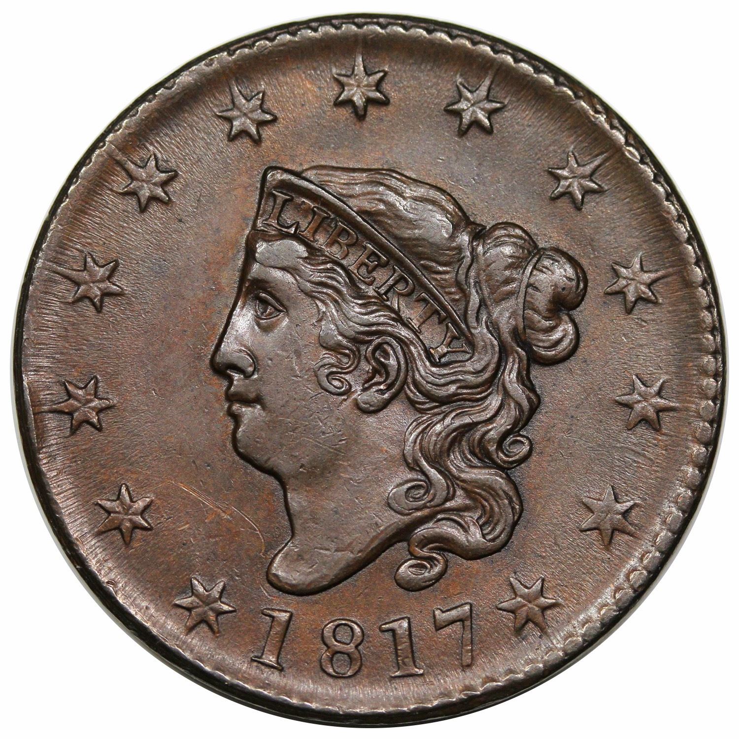 Glossy chocolate brown with some reddish-tan undertones and a few areas of darker tone on the reverse. Minor scratches inside stars 1-2, otherwise problem-free, hard, smooth surfaces. LDS with the rim break at star 3. Ex Ray Chatham - Robinson S. Brown, Jr., Superior 9/1986, lot 473 - March Wells - Tom Reynolds - Phil Moore.