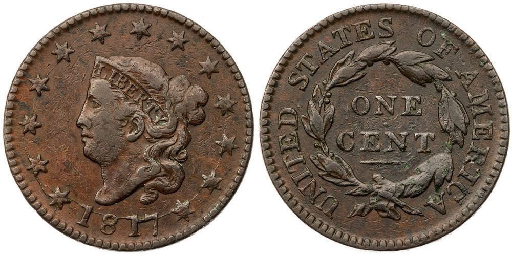 Ten points sharper but there are small contact marks and specks of verdigris scattered over both sides. None of these defects is significant but there are too many to ignore. Glossy light to medium chocolate with lighter brown in protected areas on the obverse. MDS, Grellman state d, with a radial crack from star 1 to the dentils in addition to the earlier cracks on the obverse.