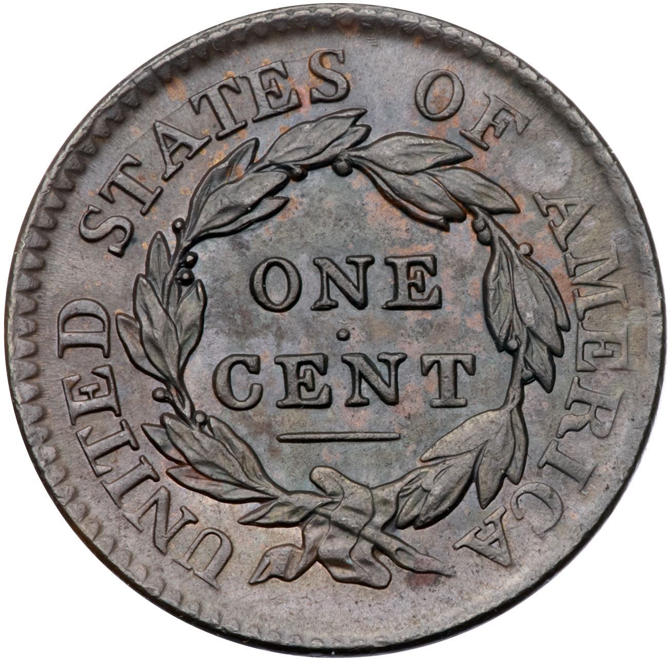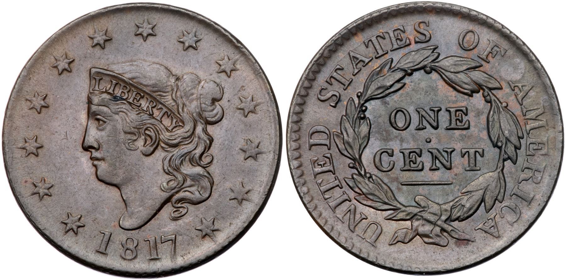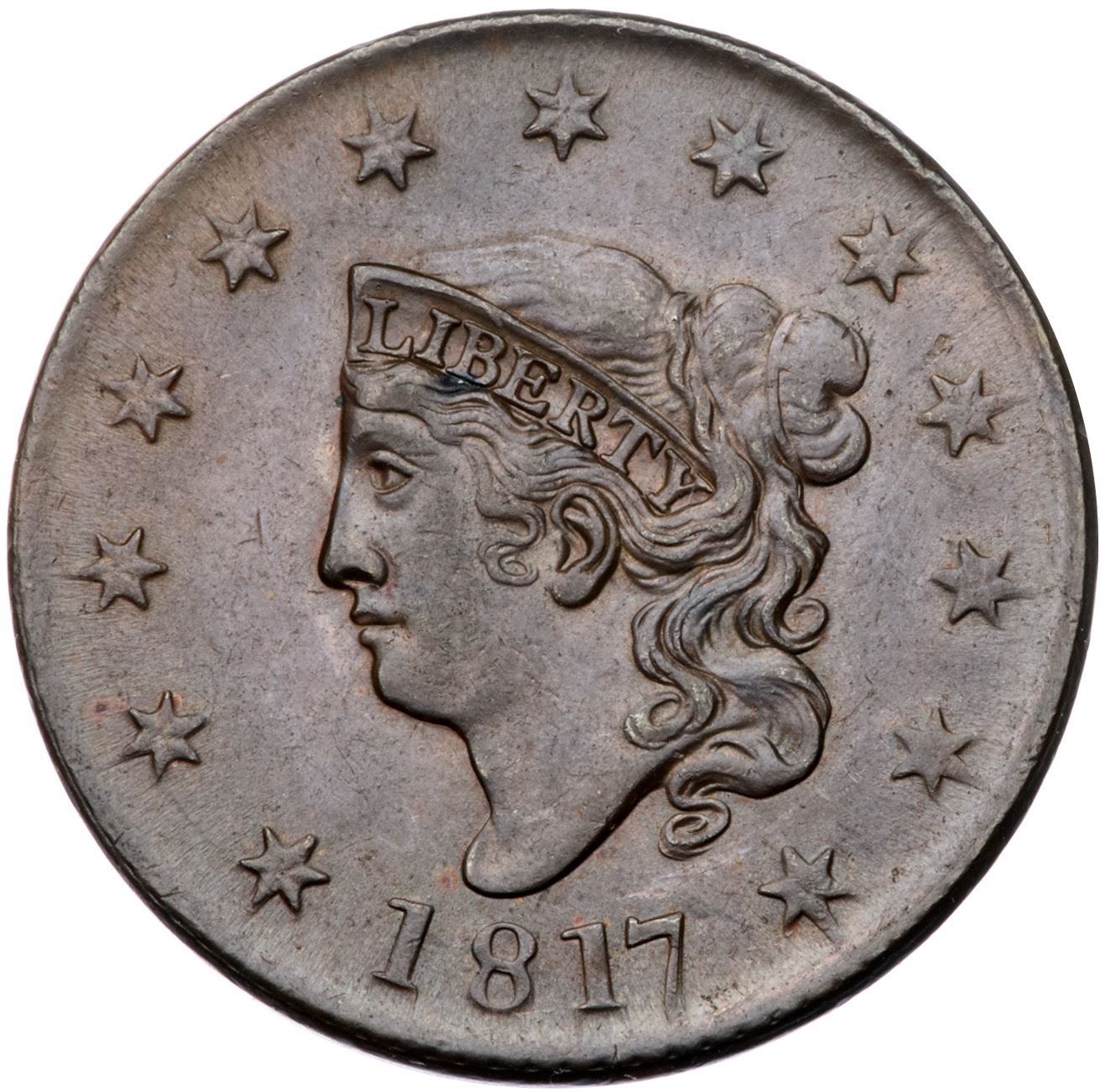 1817 N-14 R1 MS60Lustrous bluish steel brown and olive with traces of lighter reddish brown in some protected areas on the reverse. Satiny and attractive with the usual weakness on the outer part of the hair bun due to the later die state. LDS, die state b, with partial dentils on both sides (the usual Randall Hoard die state for the variety).Certificate Number: Pedigree: From the Fred H. Borcherdt Collection