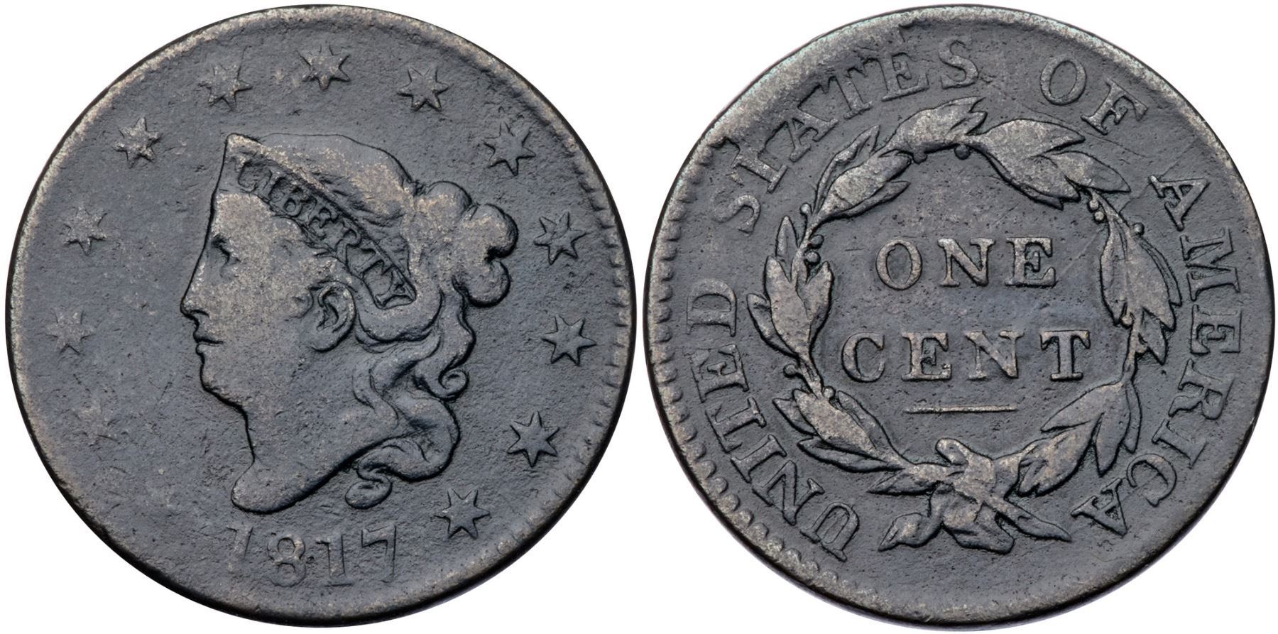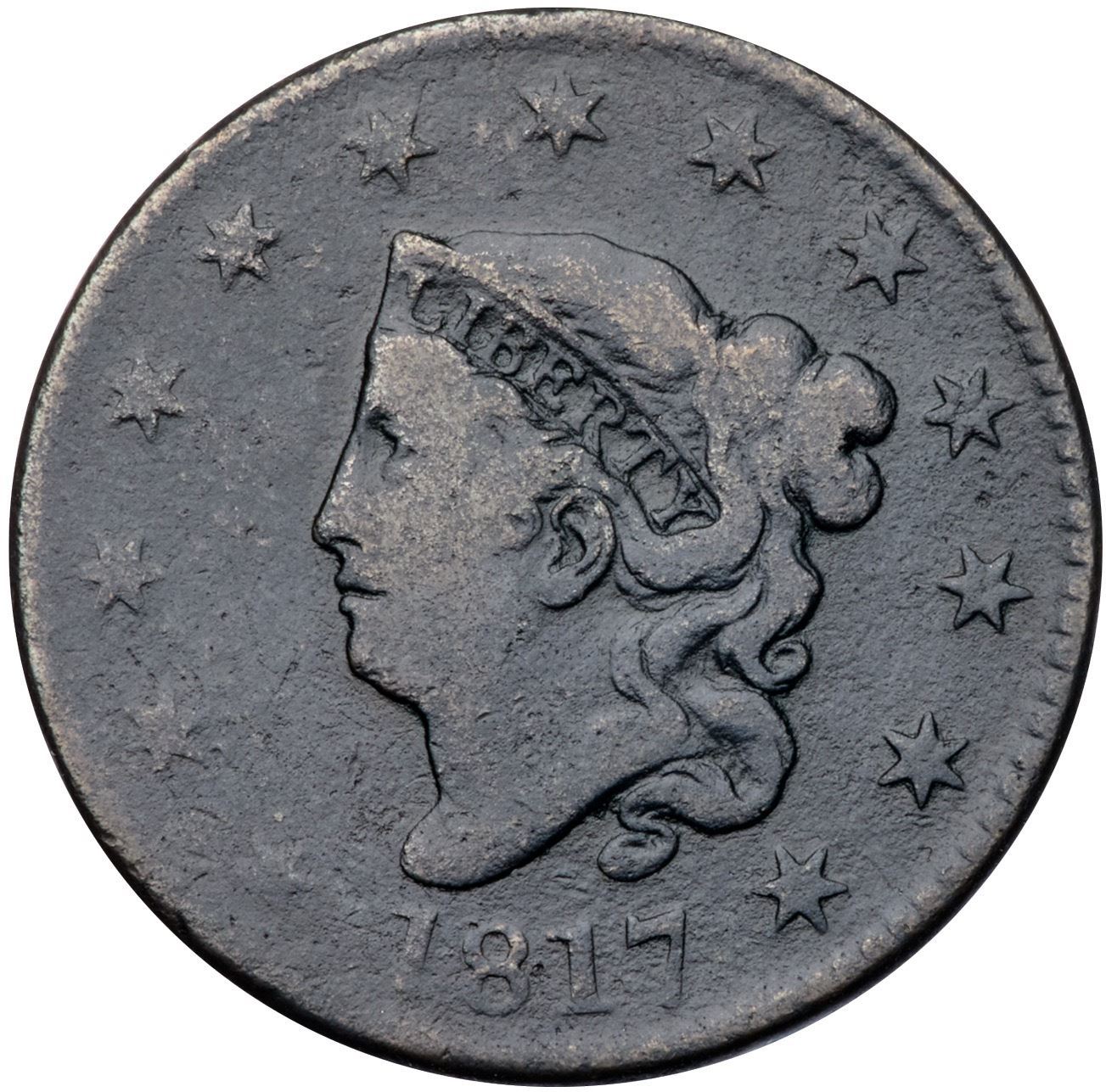 1817 N-17 R4 VG8Rather glossy steel and olive brown with lighter steel brown on the devices. No notable marks, just worn. Rare TDS, die state j, with a raised cud break over TATE. Only four examples with this fully raised cud break are known to us, and all are in low grade.Certificate Number: Pedigree: Ex Tom Hart 1/20/2005-Fred H. Borcherdt Collection