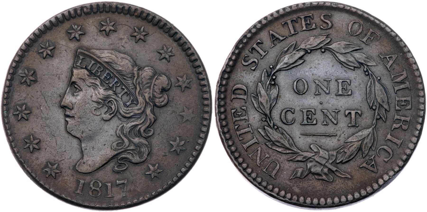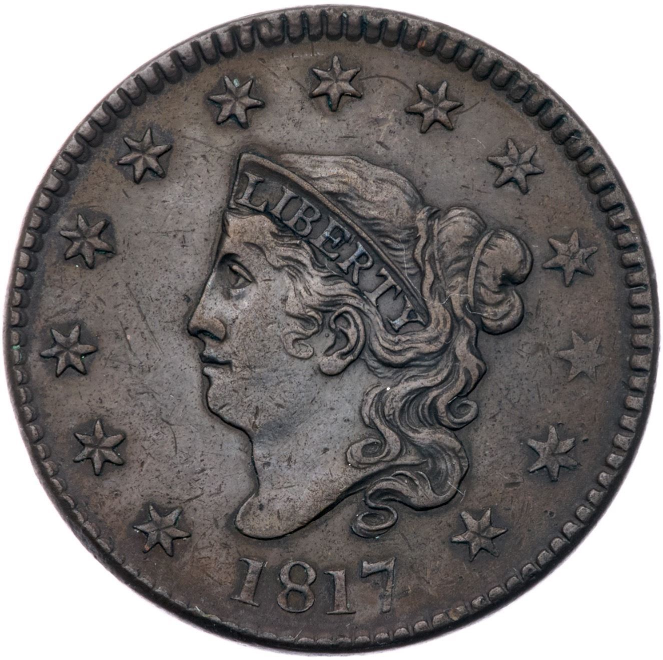 1817 N-2 R3 VF30At least 10 points sharper with several tiny contact marks on the obverse and a couple very light rim bruises on the reverse: one at the first S in STATES and another at the second A in AMERICA. None of these marks is distracting but there are too many to ignore on a cent with this level of sharpness. A curved struck-through line between stars 7 & 8 is the best identifying mark (as struck). Glossy olive brown and steel. Sharply struck EDS, die state a, with an uncracked obverse and before the radial crack to the first S in STATES. The fields are hard with no trace of flowlines. A rare die state.Certificate Number: Pedigree: From the Fred H. Borcherdt Collection