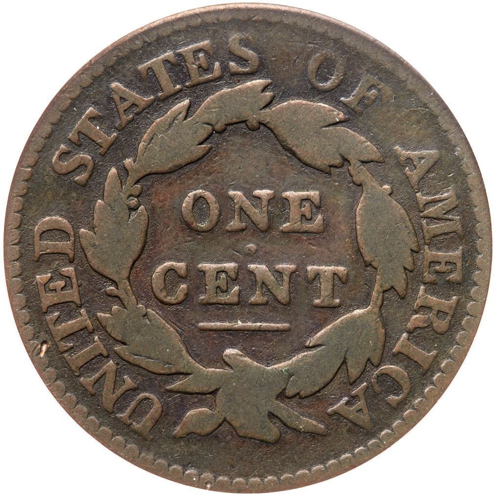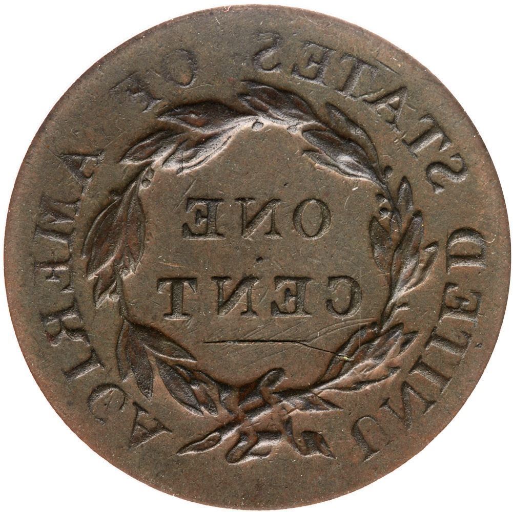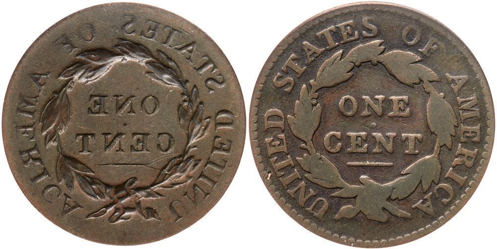 Glossy light olive and steel brown with chocolate toning in protected areas. A mate to the previous lot, just a bit more worn. The only marks are a fresh tick on the rim over the T in UNITED on the normal side and a couple fine scratches at the right end of the line below CENT on the incuse side. Nicely centered with no shift between the two impressions. Our grade is VG8. The "Full Brockage Obverse" error is noted on the PCGS label.