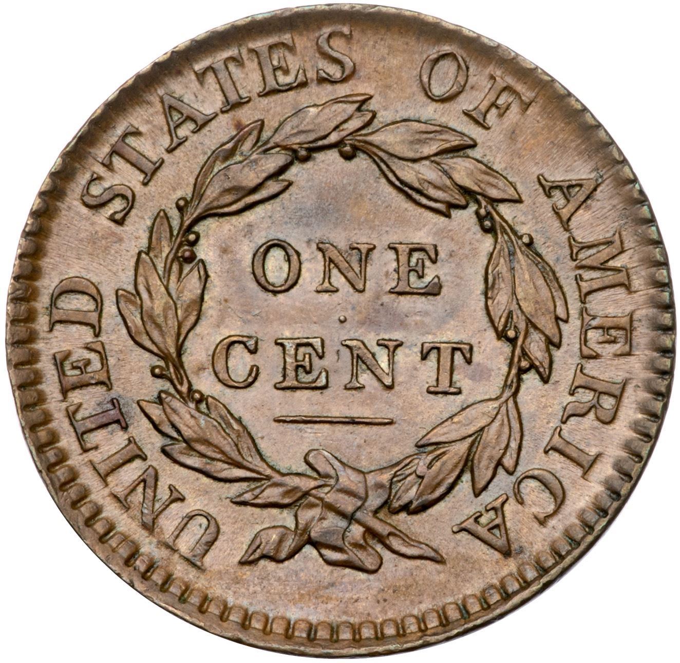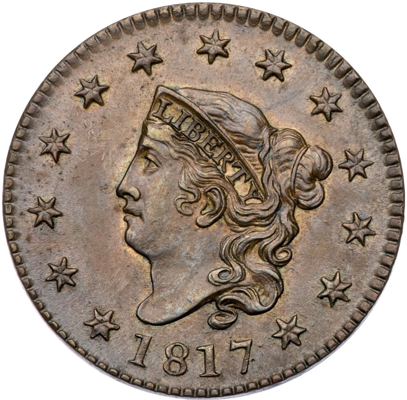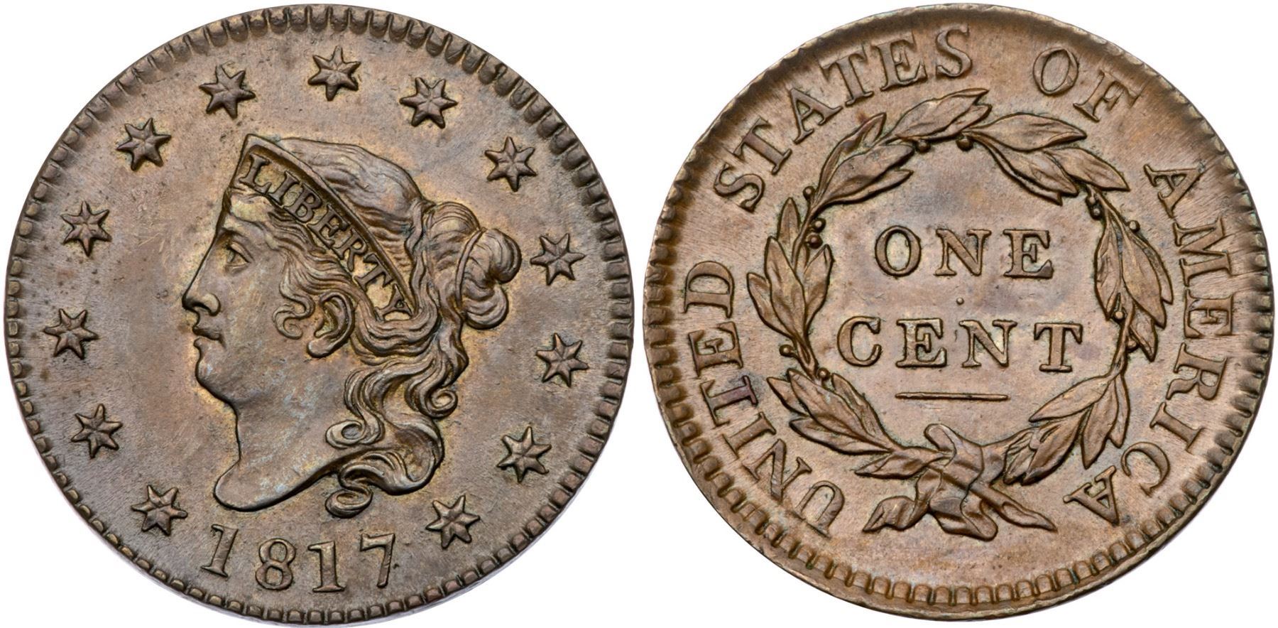1817 N-8 R2 AU55Glossy light brown and chocolate. Satiny mint luster covers the fields and protected areas and this cent has very nice eye appeal. Very little friction on the highpoints and the only notable mark is a spot of reddish brown toning on the lower part of the T in UNITED. E-MDS, die state a, with lightly flowlined fields and no trace of a "Mouse" break on top of the head.Certificate Number: Pedigree: From the Fred H. Borcherdt Collection
