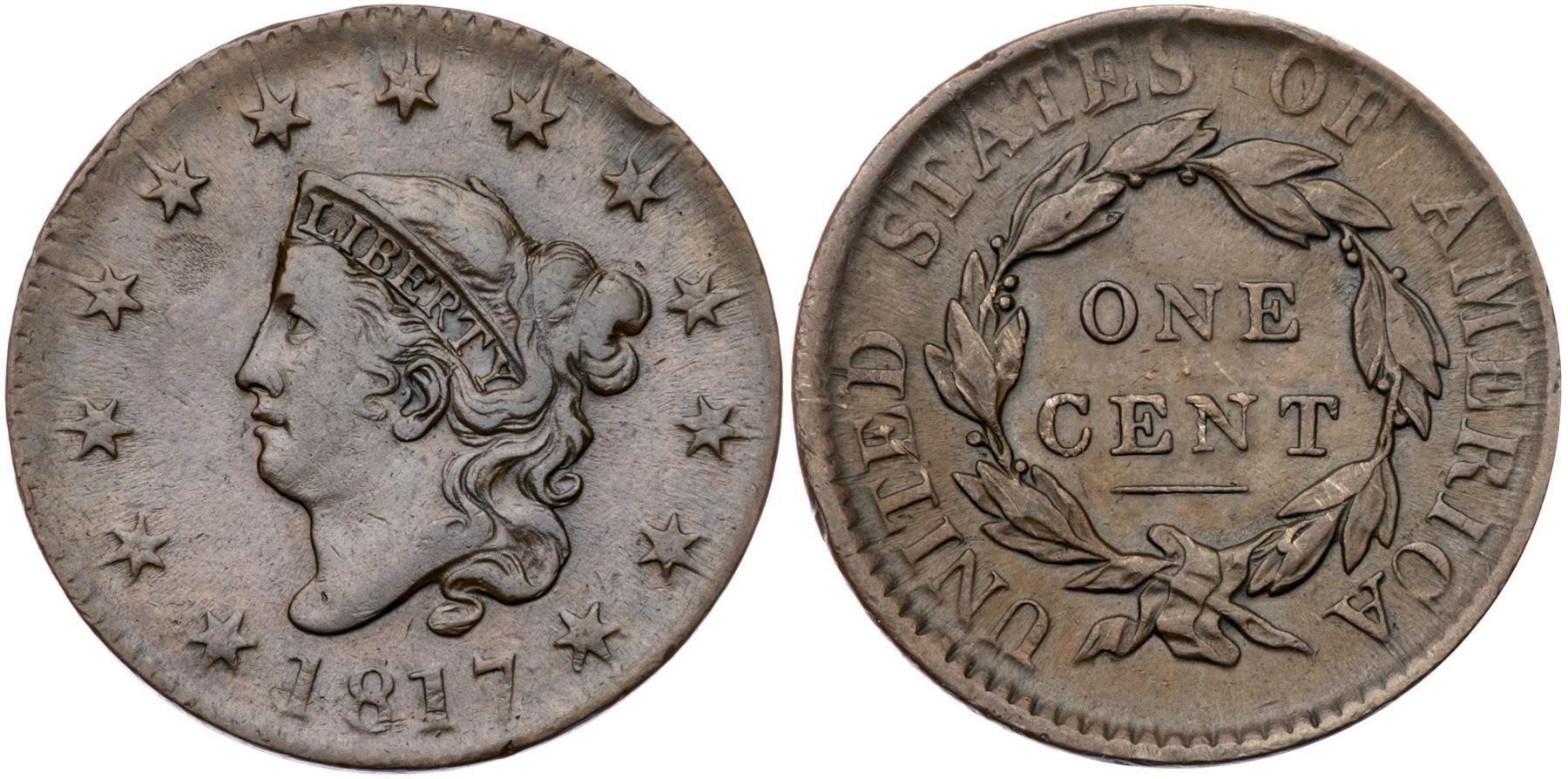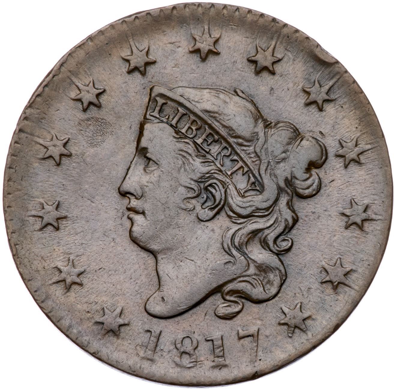 1817 N-8 R2 VF25Glossy light to medium chocolate brown delicately mottled with lighter brown in the obverse fields. Smooth with light wear. Flowline frost shows in the protected areas. The only marks are a small rim bruise over star 9 and a few ticks on the bottom of the 81. LDS, die state d, with a fully developed "Finger Mouse" break on top of the head below star 8.Certificate Number: Pedigree: From the Fred H. Borcherdt Collection