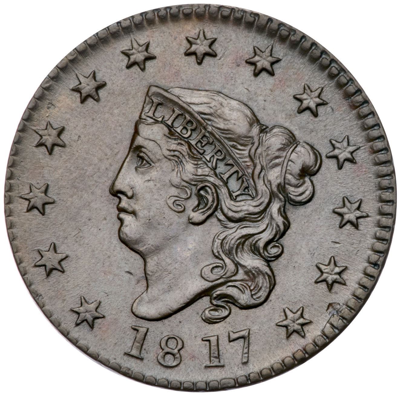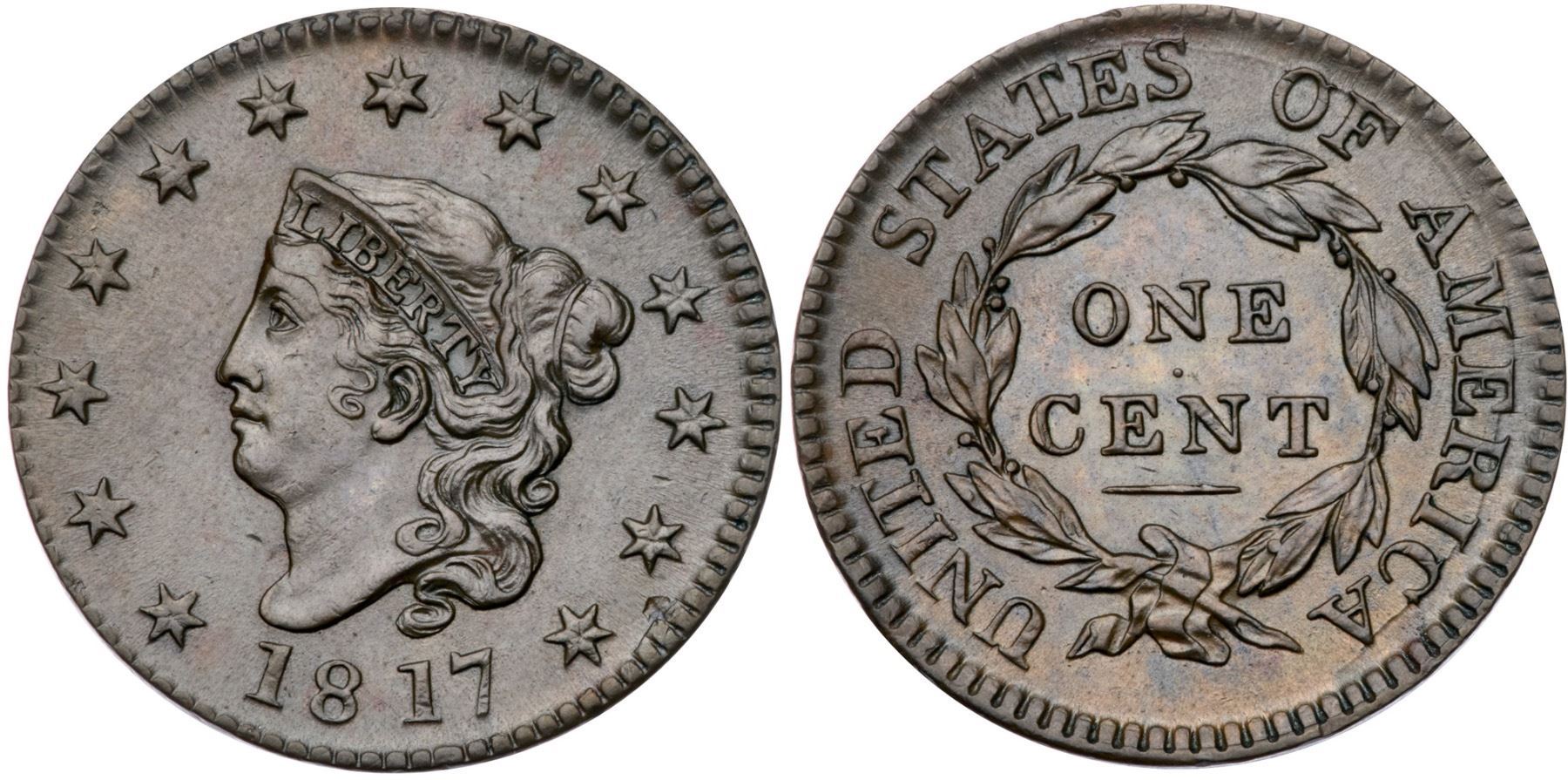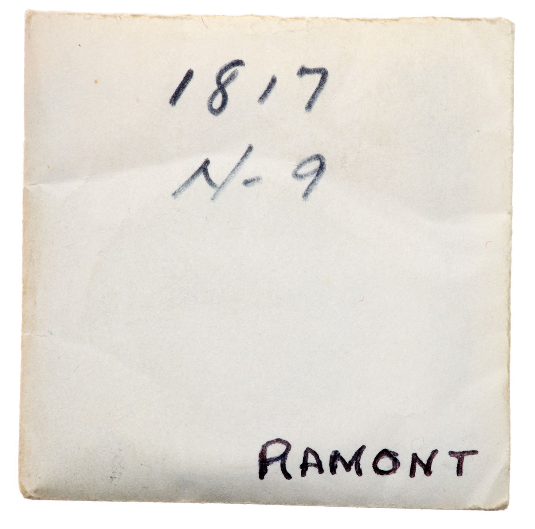 1817 N-9 R2 EF45Glossy light to medium chocolate and olive with lighter brown in protected areas on the reverse. Lightly worn with satiny fields and great eye appeal for the grade. The only defect is a small planchet flake at the dentils under star 12 (as struck). E-MDS, die state a late. The fields are lightly flowlined and the die line from the throat is still visible. There is no trace of a "Mouse" break on top of the head. A fine triple profile shows on the lower half of the nose, the nostril, and on the throat.Certificate Number: Pedigree: Ex George Ramont-Fred H. Borcherdt Collection (includes the Ramont collection envelope)