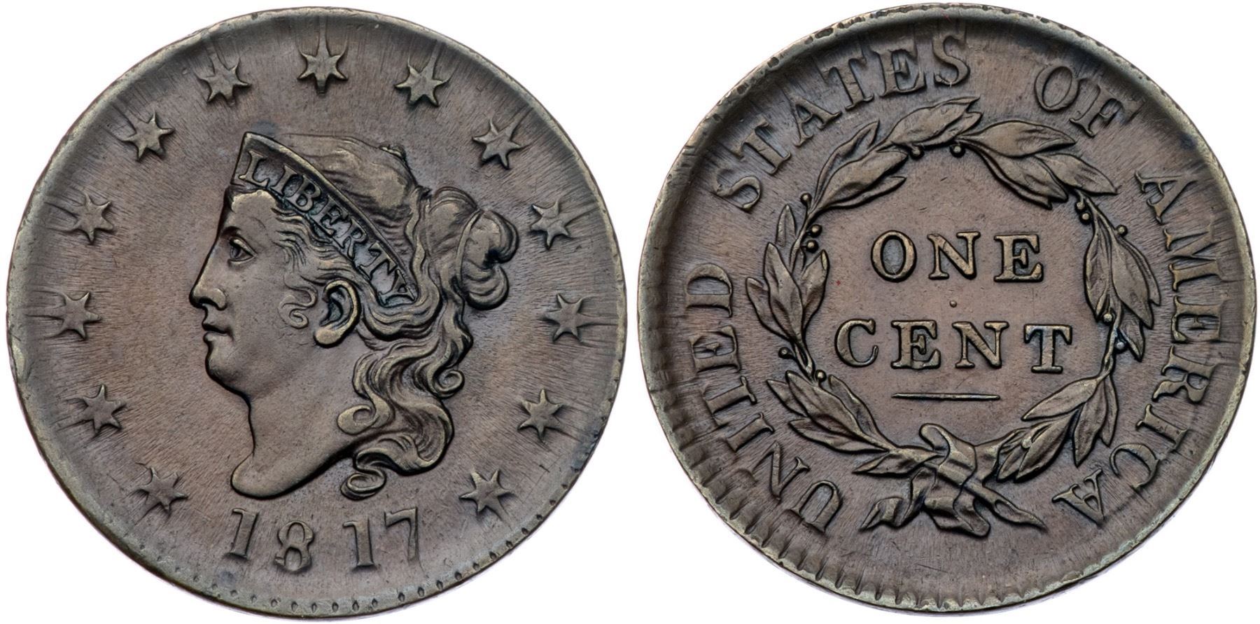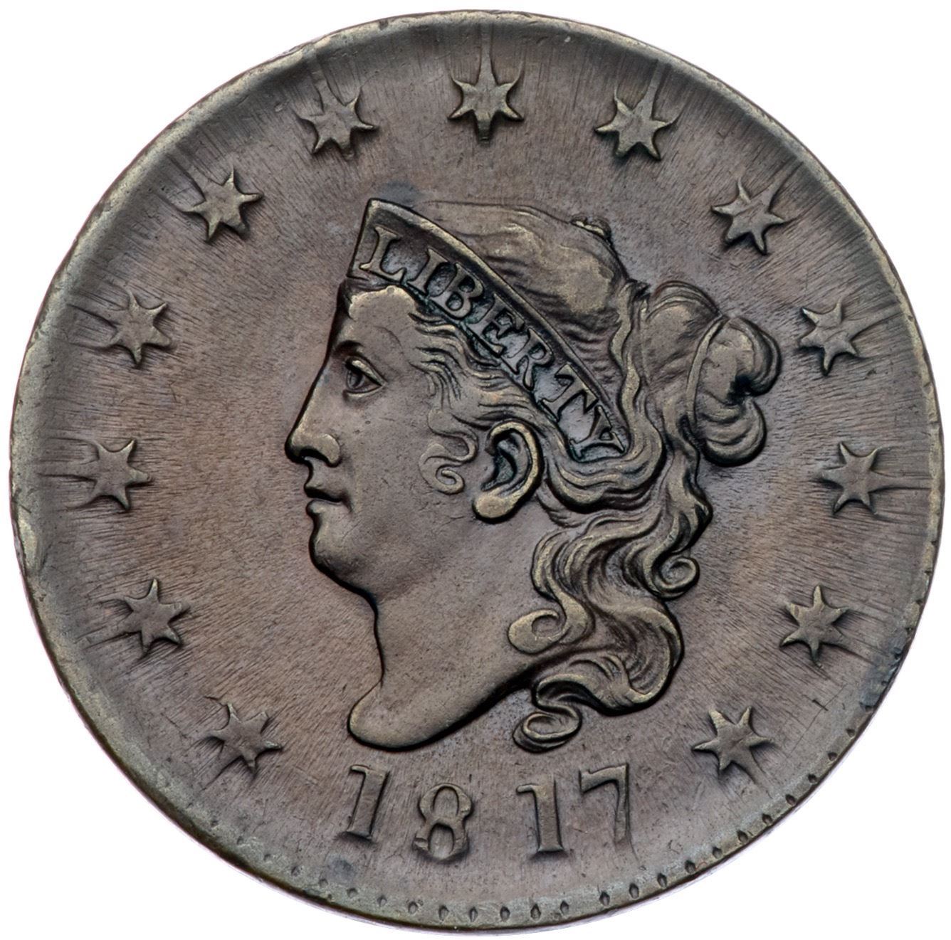 1817 N-9 R2 VF35+Glossy chocolate brown with flowline luster covering the fields. Lightly worn and the only notable marks are a couple small rim nicks, the strongest off the lower left point of star 3. LDS, die state d, with a fully formed "Mouse" break resting on top of the head under star 8.Certificate Number: Pedigree: From the Fred H. Borcherdt Collection