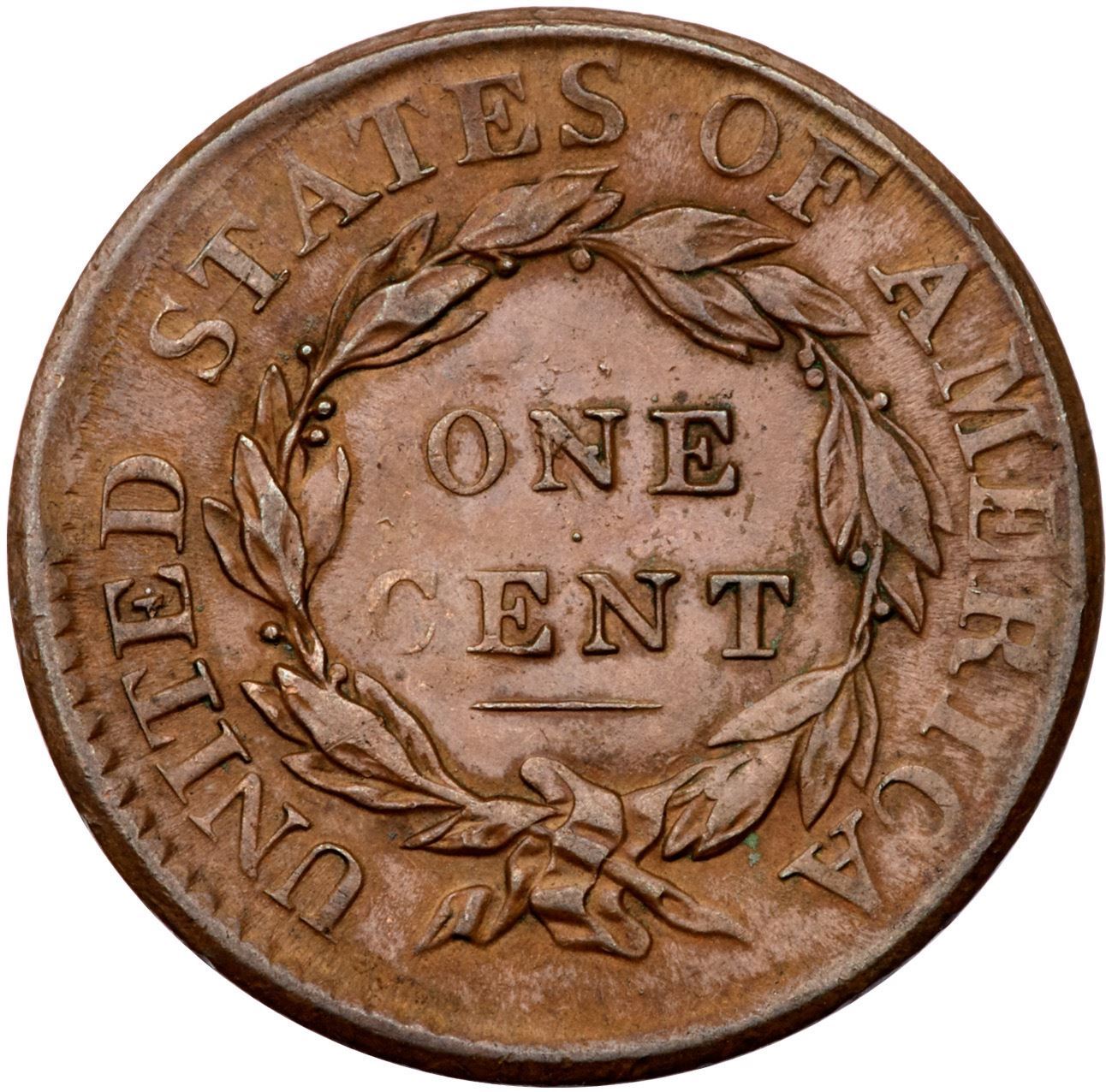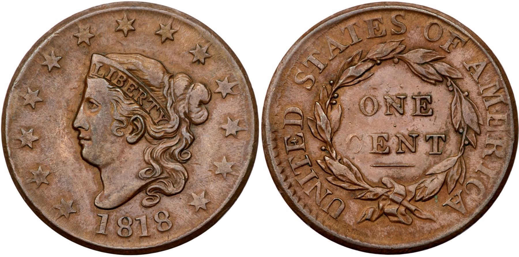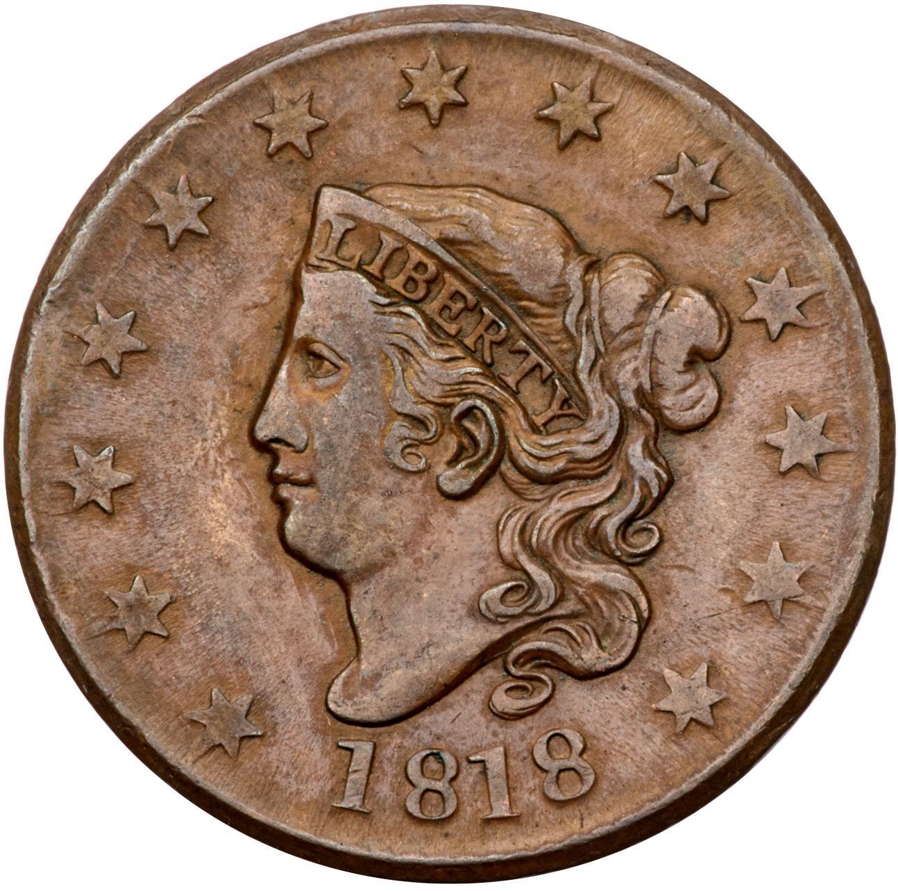1818 N-1 R2 VF30Choice glossy medium brown with slightly darker brown on the highpoints. Mint frost shows in the fields and protected areas and this cent has great eye appeal for the grade. Lightly worn with no notable marks. Has the eye appeal of a higher grade. VLDS, die state d late. The narrow rim cud at star 2 does not show due to centering, but the die clashmarks in the field before the face are clear. The latest state seen. Struck with the reverse rotated 30 degrees CCW.Certificate Number: Pedigree: From the Fred H. Borcherdt Collection