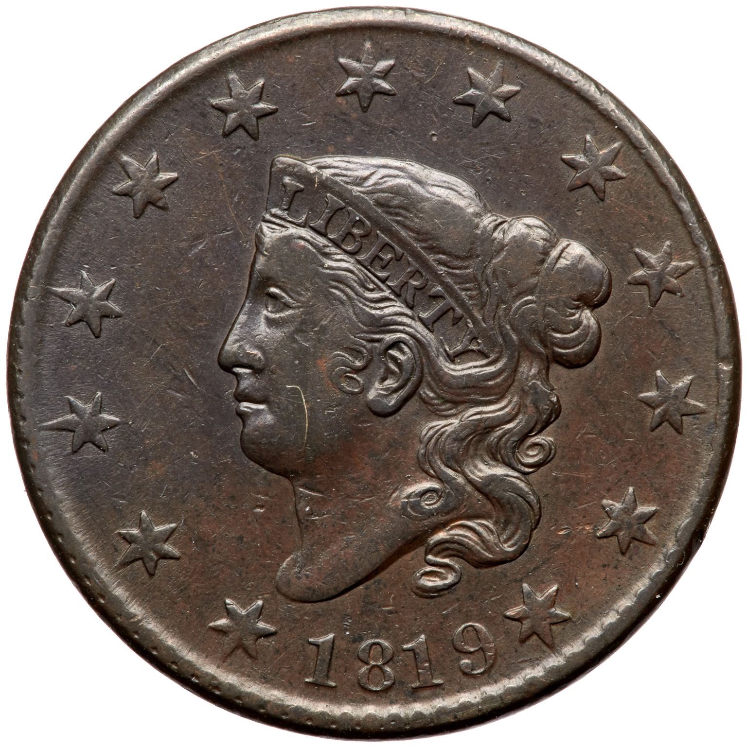 Glossy dark chocolate brown. Smooth and attractive, just lightly worn. The only marks are a few light nicks including a diagonal one over the right top of the N in ONE. MDS with lightly flowlined fields and a fine die crack from the bust tip, but the fine recutting on the right top of the N in UNITED is still clear. A nice cent for the grade.