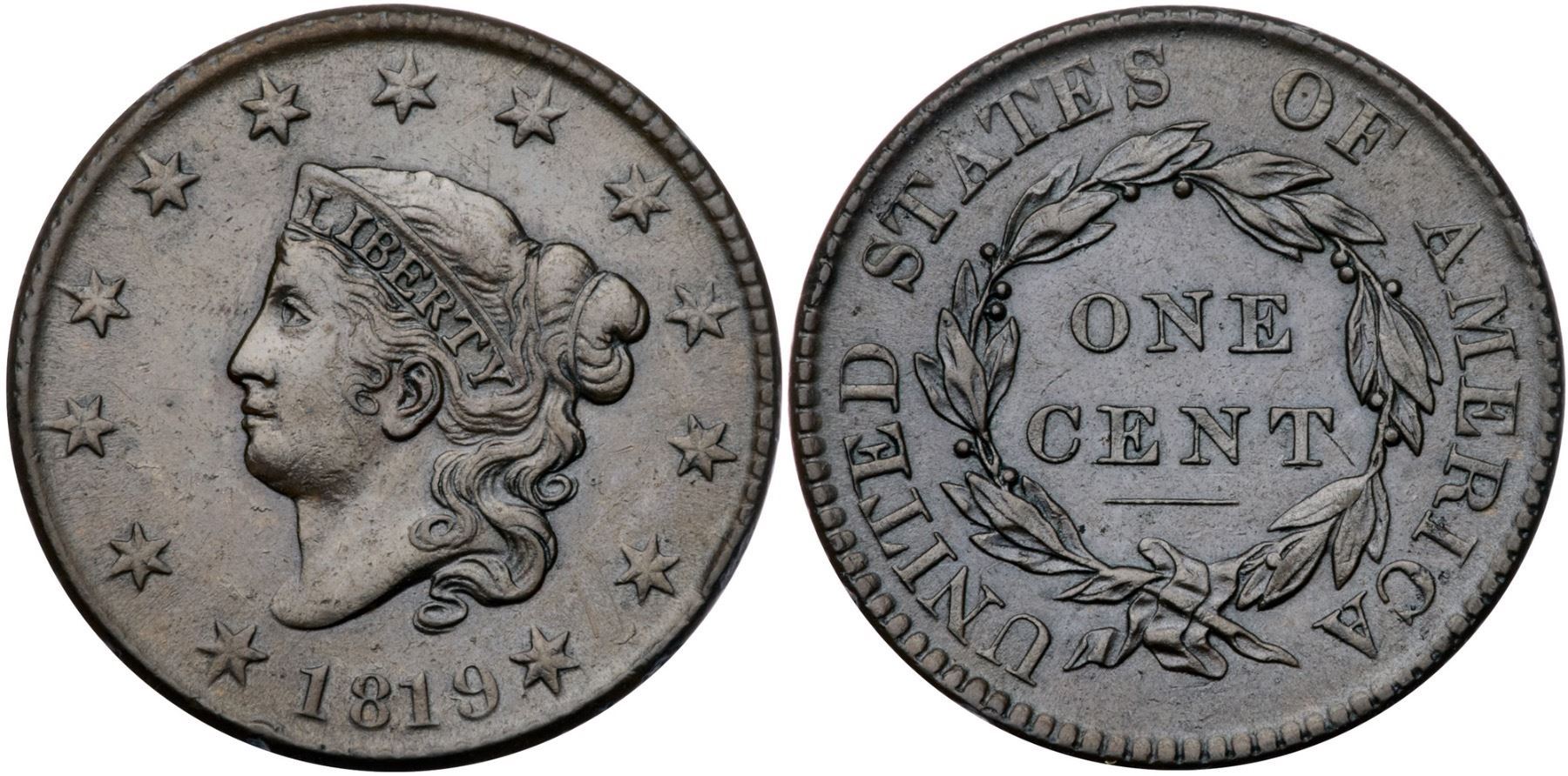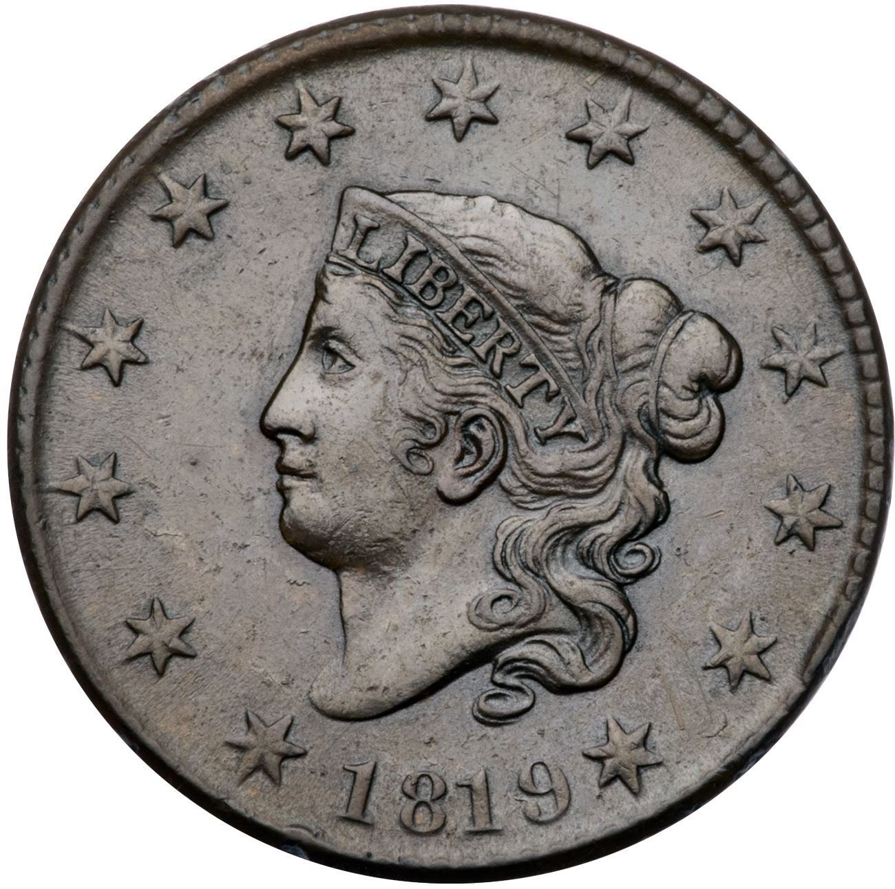 1819 N-3 R3- Close Stars VF30+Choice glossy uniform brown and light chocolate. Fine flowline frost covers the fields and protected areas, and this cent has wonderful eye appeal. The only marks are a small rim nick left of the date and a very light rim bruise right of star 12. A really attractive cent, just lightly worn. M-LDS, die state c. The dentils on the obverse are incomplete and the repunching over the right top of the N in UNITED is gone.Certificate Number: Pedigree: Ex Garry F. Fitzgerald 11/13/1968-Jules Reiver 2/8/1985-Fred H. Borcherdt Collection