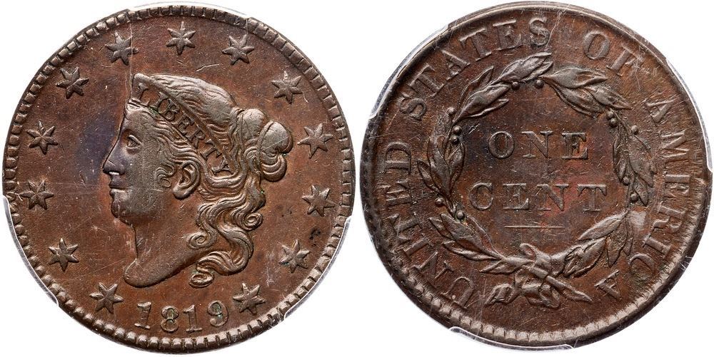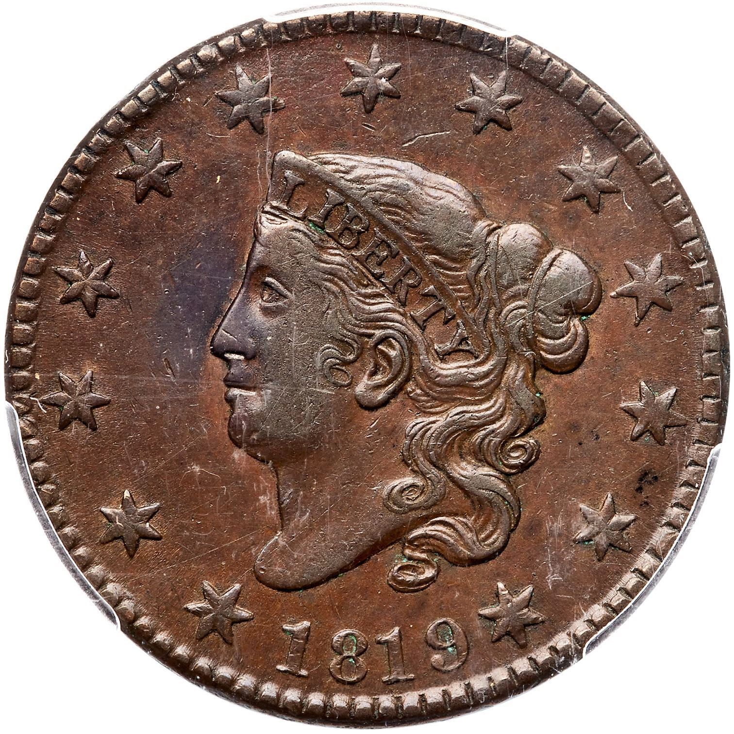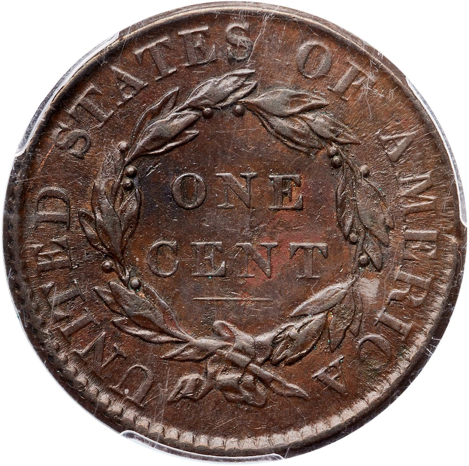 Attractive glossy chocolate brown with traces of frosty lighter brown and tan in a few of the protected areas. Smooth with just a touch of friction on the devices. The only notable marks are a barely visible rim bruise at star 5 and a streak of microscopic reddish roughness from the E in ONE to the N in CENT. MDS, Grellman state b. The die line that connects the feet of the T & E in STATES is dull and no longer touches the T. Our grade is EF40, at the lower end of the condition census for this scarce variety.Certificate: 36637.50/28632292Pedigree: Ex Chris McCawley 5/2/2014-Chuck Hall Collection, Goldbergs 9/13/2020:101 (lot ticket included)