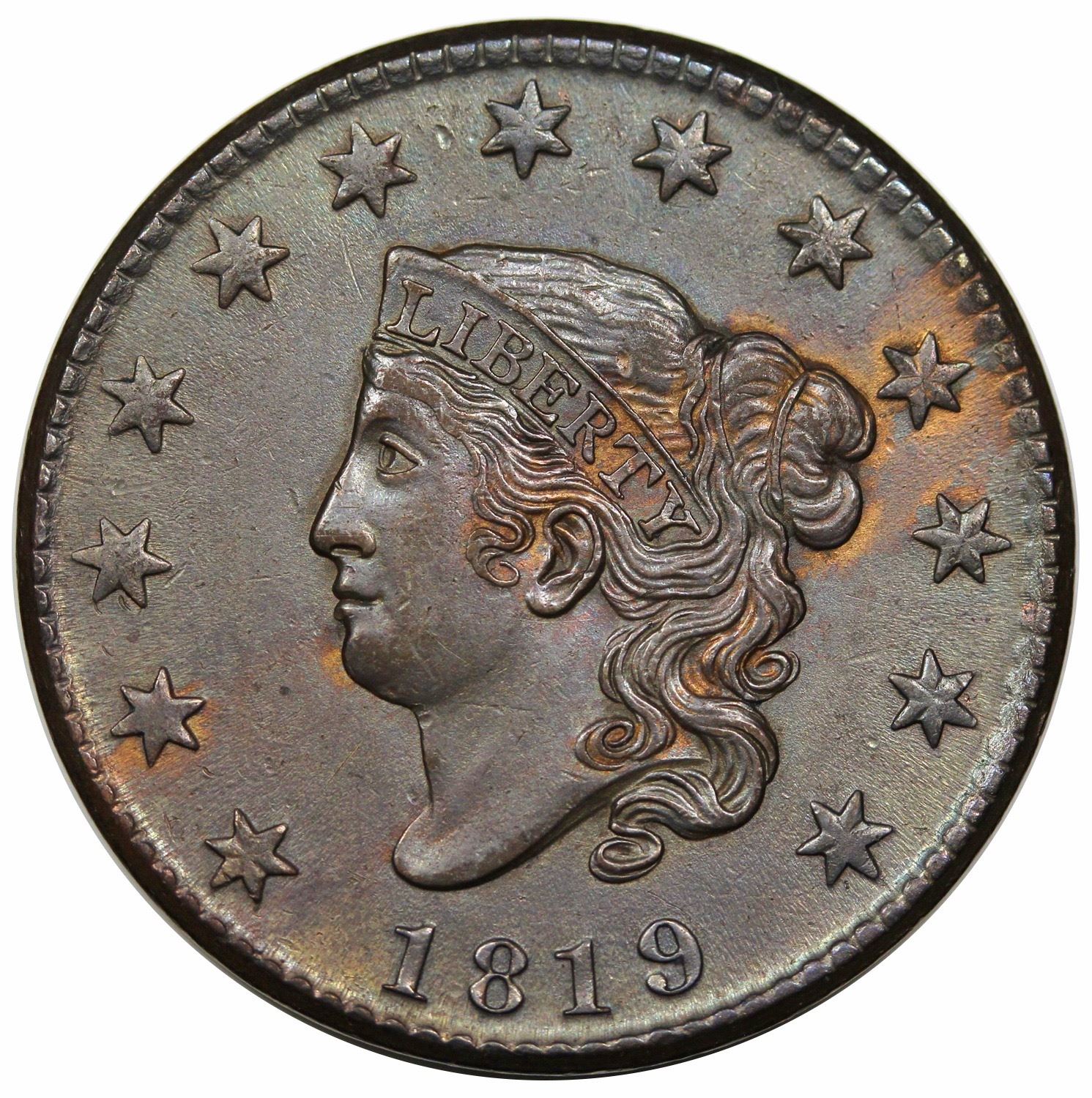 Small Date. 10 points sharper but lightly cleaned and almost fully retoned to a pleasing light olive brown, just a streak of artificial orange color remains on the obverse. Maybe a dozen tiny nicks scattered across each side, none individually notable or bothersome. Decent quality and eye appeal overall. MDS.
