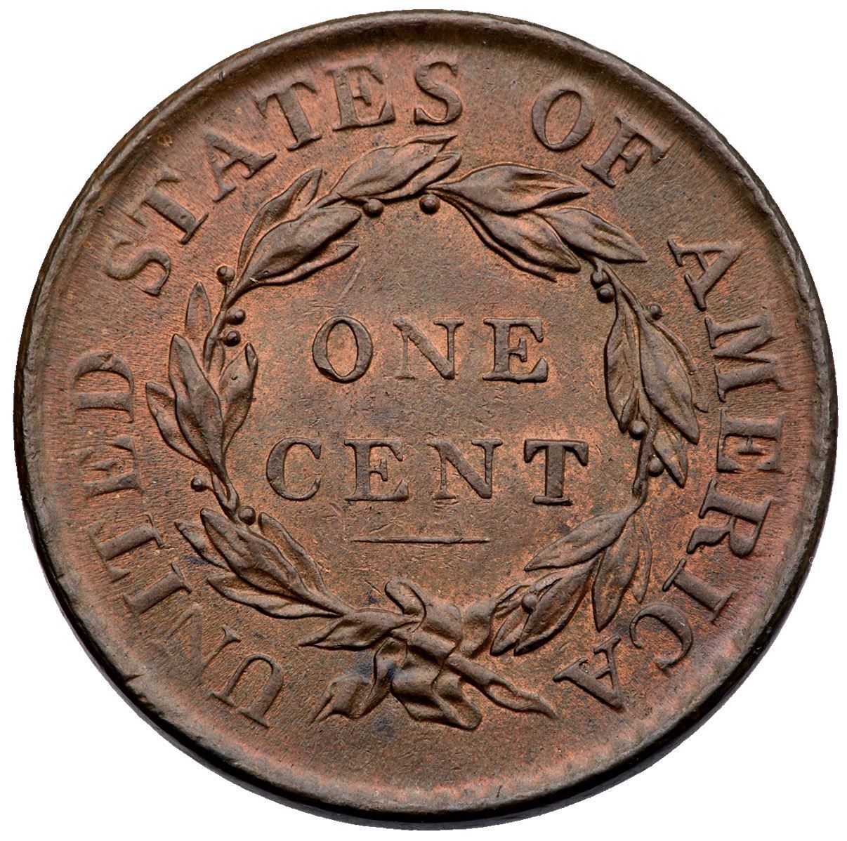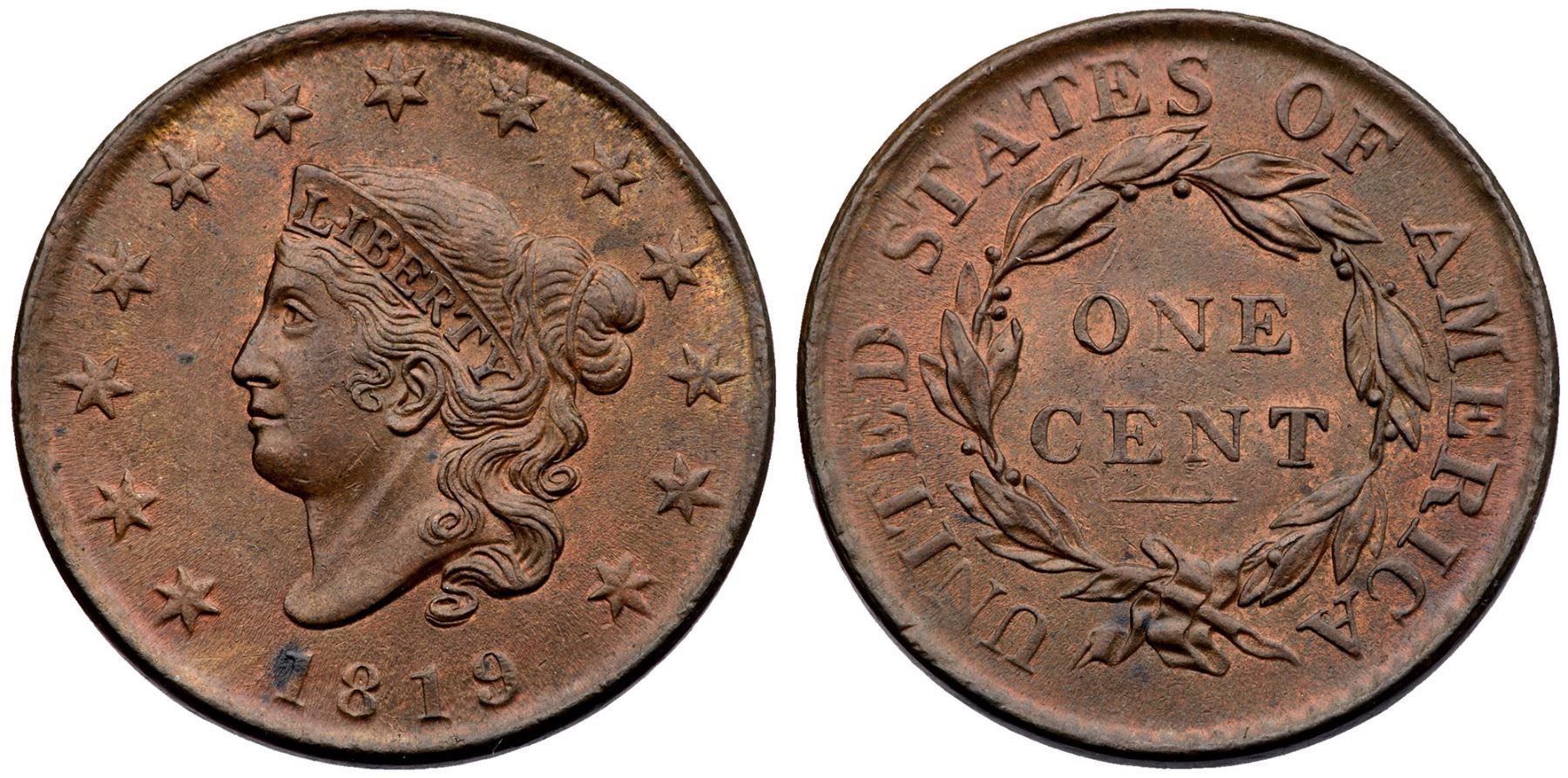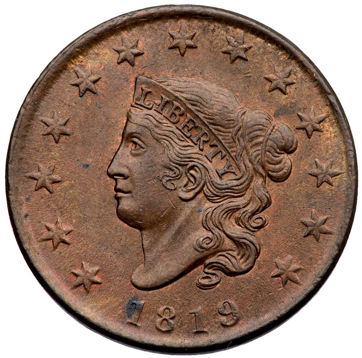 1819 N-9 R-1 Small Date MS60Glossy light to medium chocolate brown and steel with faded mint red covering 5-10% of the planchet, mostly on the reverse. Underlying frosty mint luster covers the fields and protected areas. The only mark worthy of mention is a spot of darker olive brown toning on the first 1 in the date. M-LDS. The repunching on the R in AMERICA is weak but visible. Most likely from the Randall Hoard of mint state cents.Certificate Number: Pedigree: Ex; EAC Sale St Louis 5/2022:285 - William Schwartz