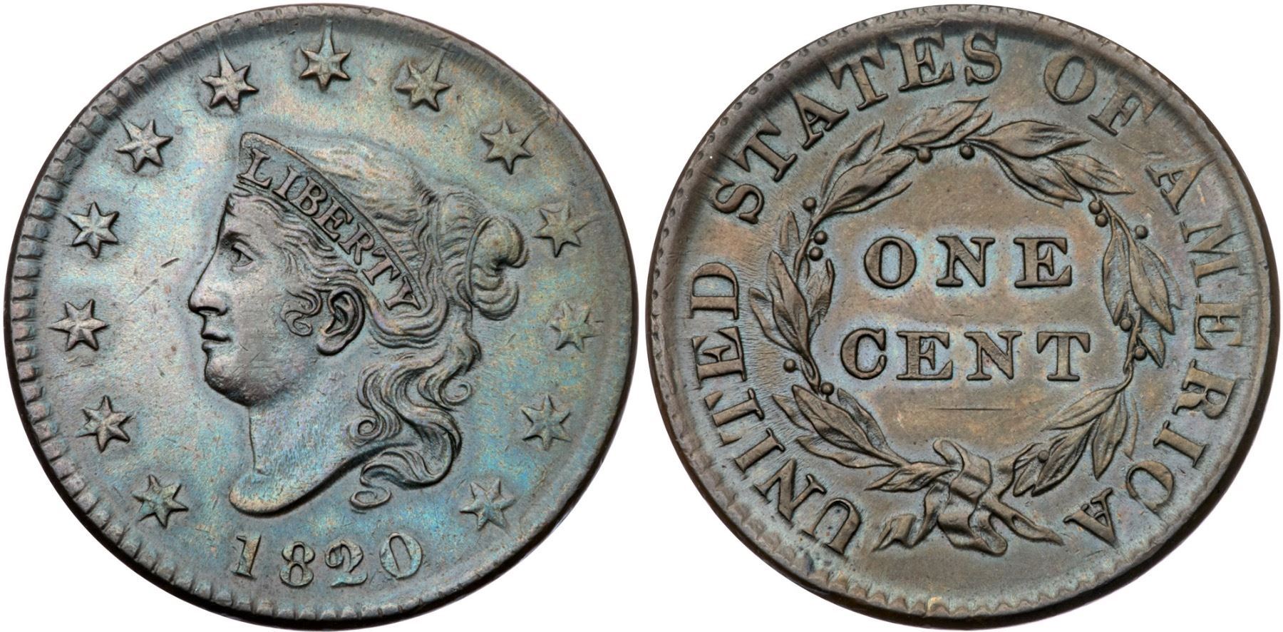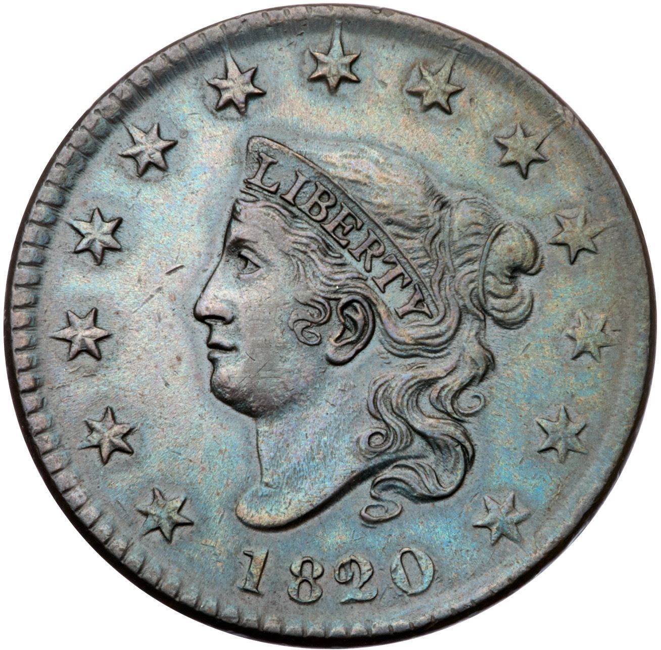 1820/19 N-2 R2 Overdate Small 20 over 19 VF35Glossy olive and medium chocolate brown. Smooth and quite attractive with very light wear on the devices. The fields are smooth and slightly reflective thanks to a fresh die lapping. Just a few trivial marks including a tiny tick low on the front edge of the neck and a very faint horizontal scuff on the cheek (only visible if you get the light at just the right angle). LDS, die state c. The undertype 1 is clear but only a trace of the undertype 9 is visible at the lower left of the 0.Certificate Number: Pedigree: Ex Jim Bergman 1/1985-Del N. Bland-Fred H. Borcherdt Collection