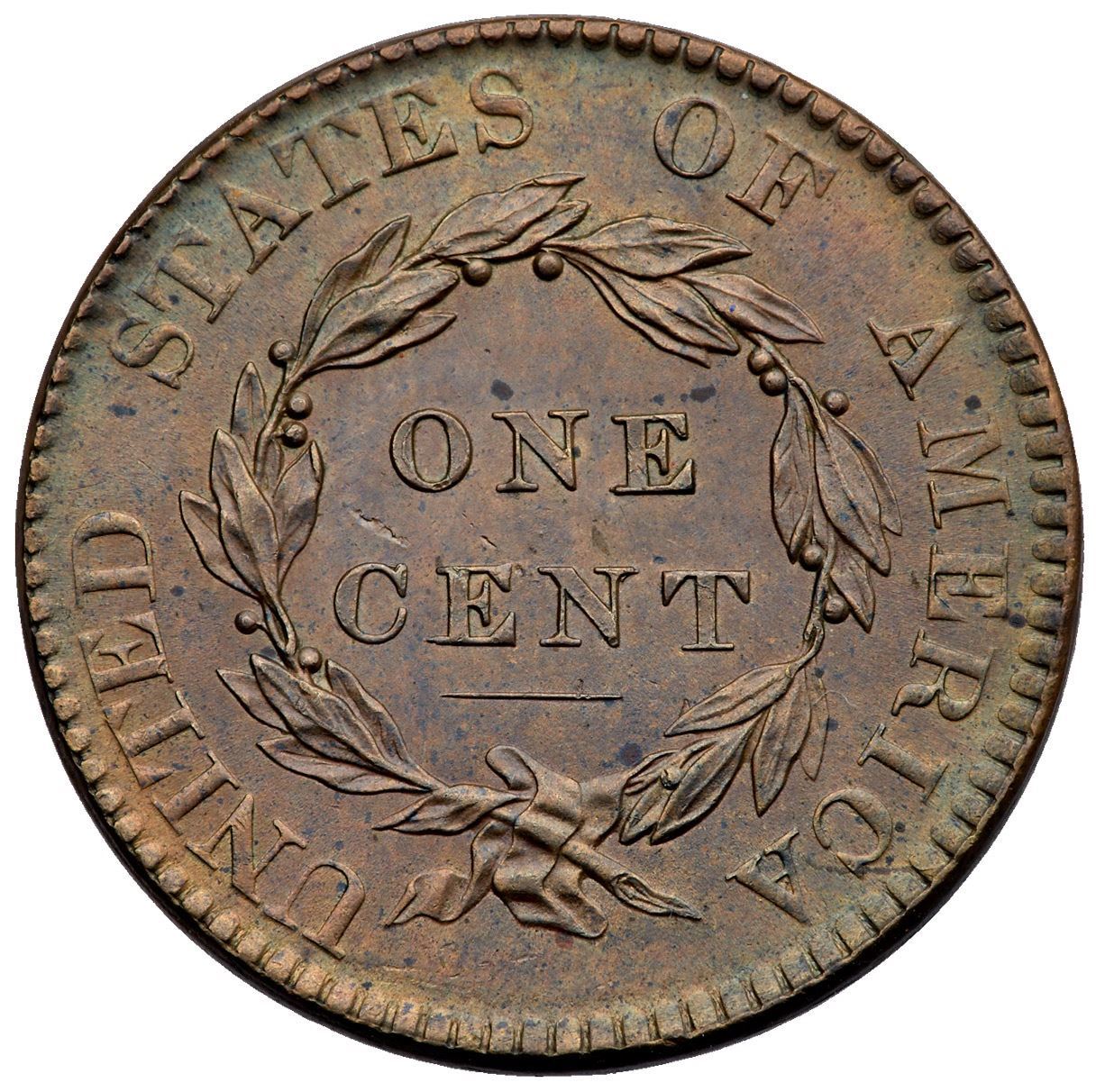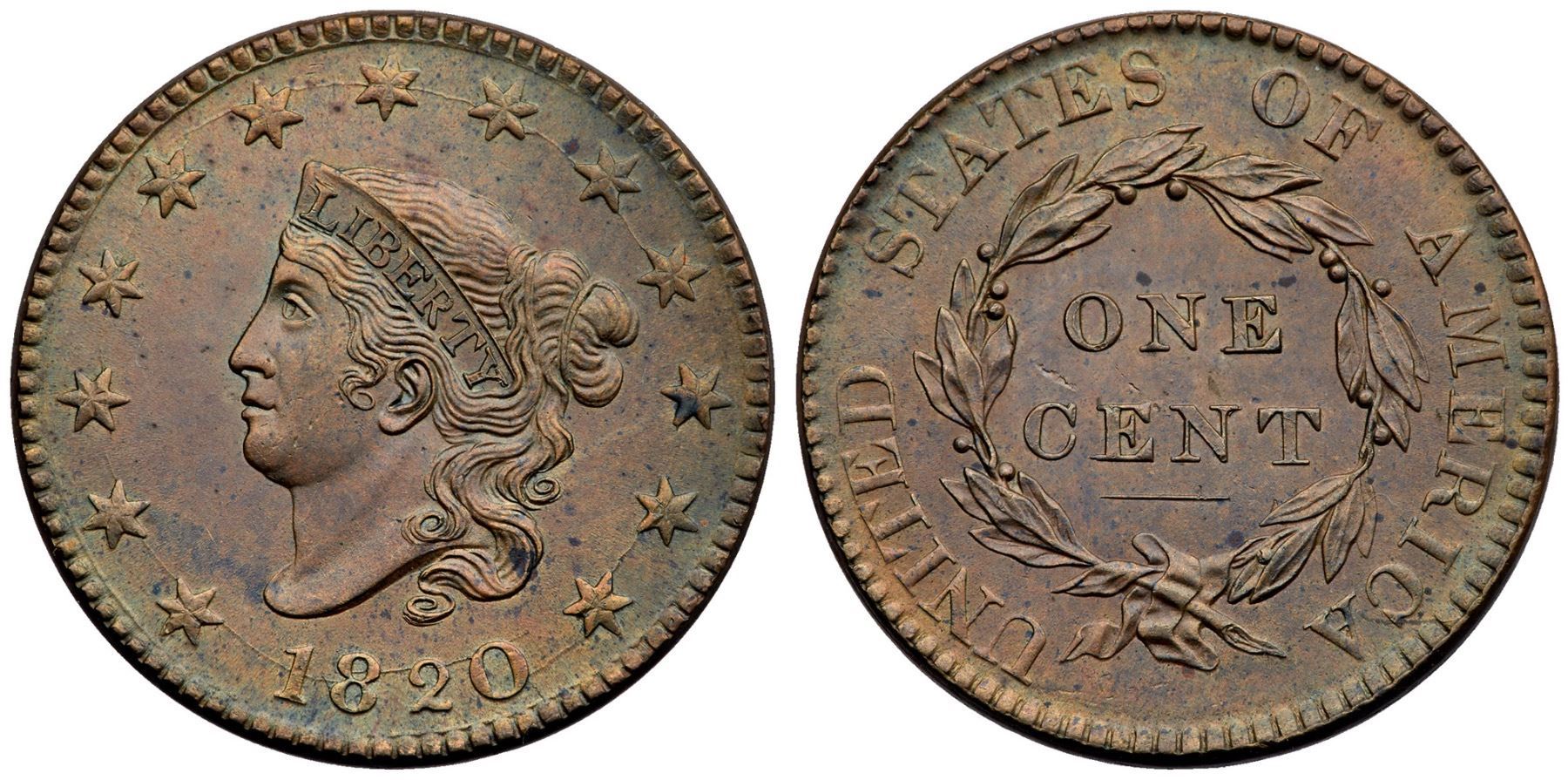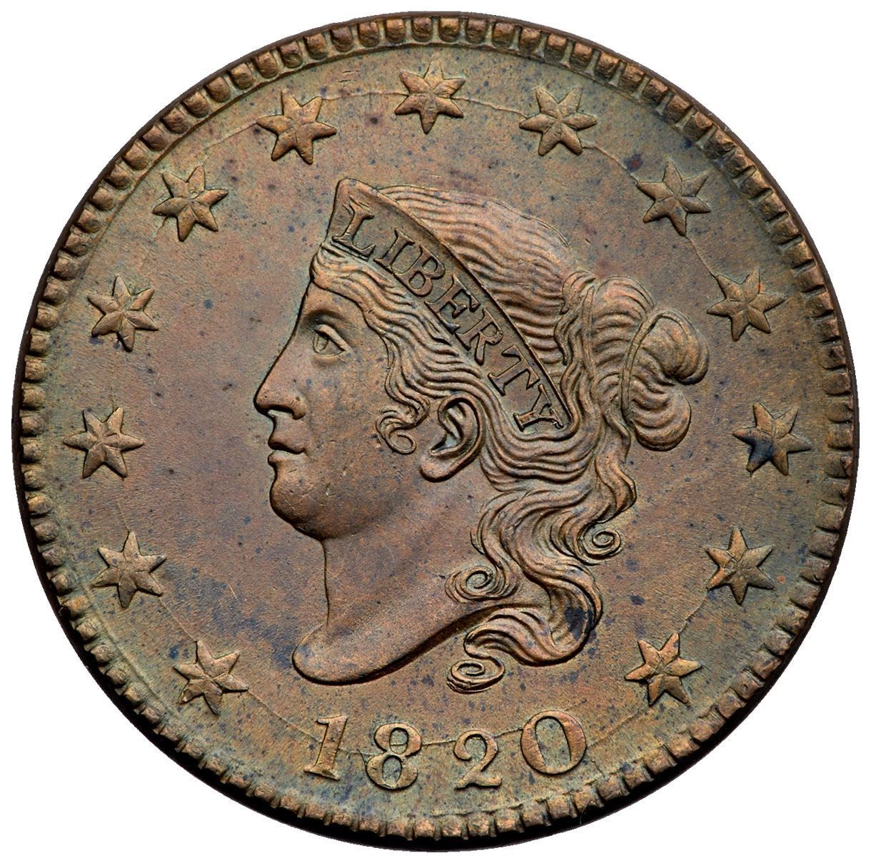 1820 N-13 R-1 MS62Lustrous olive brown with tan tones mottled with steel spots. A tiny nick over C in CENT is the best identifying mark. Satiny cartwheel luster covers the surfaces. Sharply struck MDS, the usual Randall Hoard die state for the variety.Certificate Number: Pedigree: Ex; unknown coin show - William Schwartz