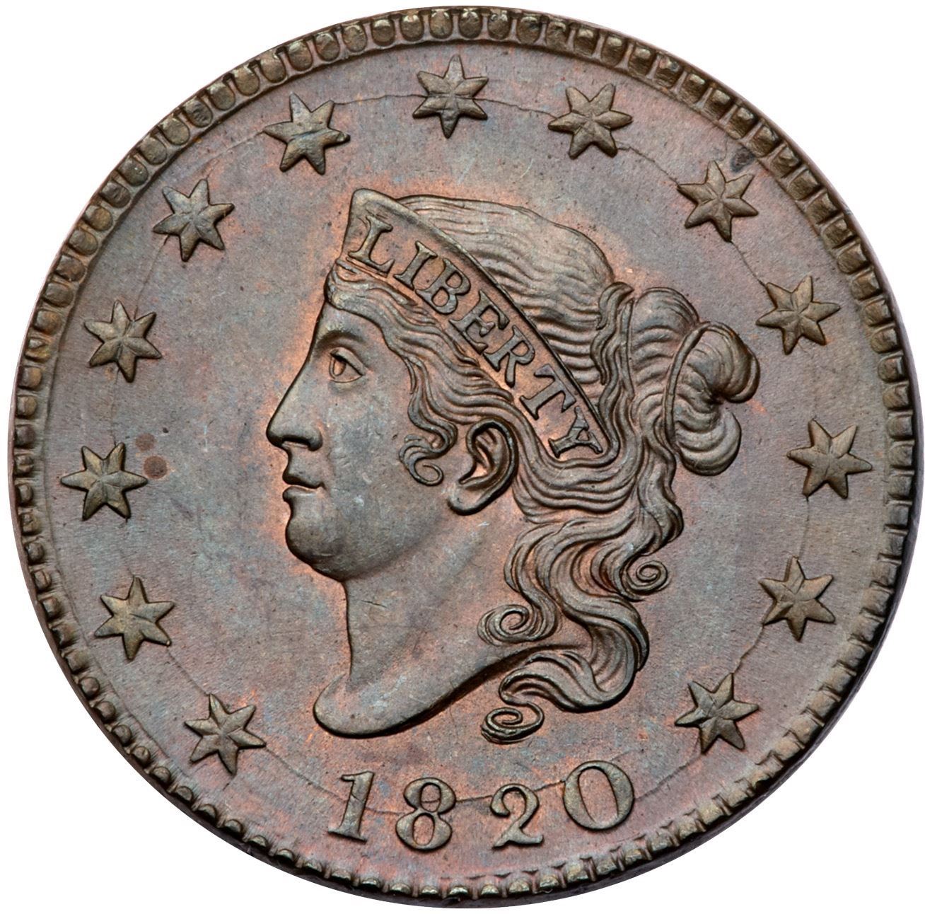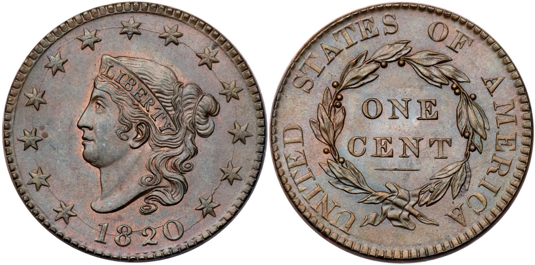 1820 N-13 R1 Large Date MS63Choice lustrous light bluish steel brown with traces of mellowed mint red in protected areas on the obverse. Satiny and sharp with no trace of friction on the highest points of the devices. The only marks are two tiny specks of medium brown toning just right of star 3. Sharply struck MDS, die state a late, with the usual die cracks through the date and stars. Almost certainly another survivor from the Randall Hoard. A great date or type coin.Certificate Number: Pedigree: From the Fred H. Borcherdt Collection