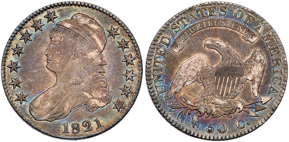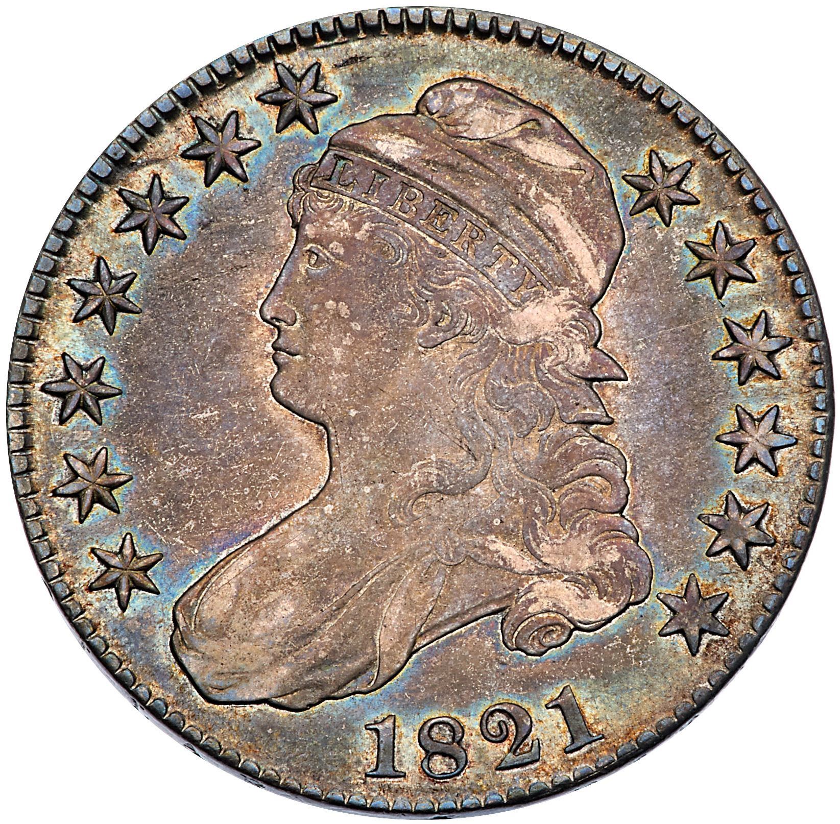 1821 Overton-104a R2 VF35Very attractive glossy light to medium gray and steel with frosty lighter silver in protected areas. Both sides have attractive light bluish steel overtones. Lightly worn with no defects. The die crack at UNITED STAT is strong but the other crack at MECertificate Number: Pedigree: Ex Fred H. Borcherdt Collection