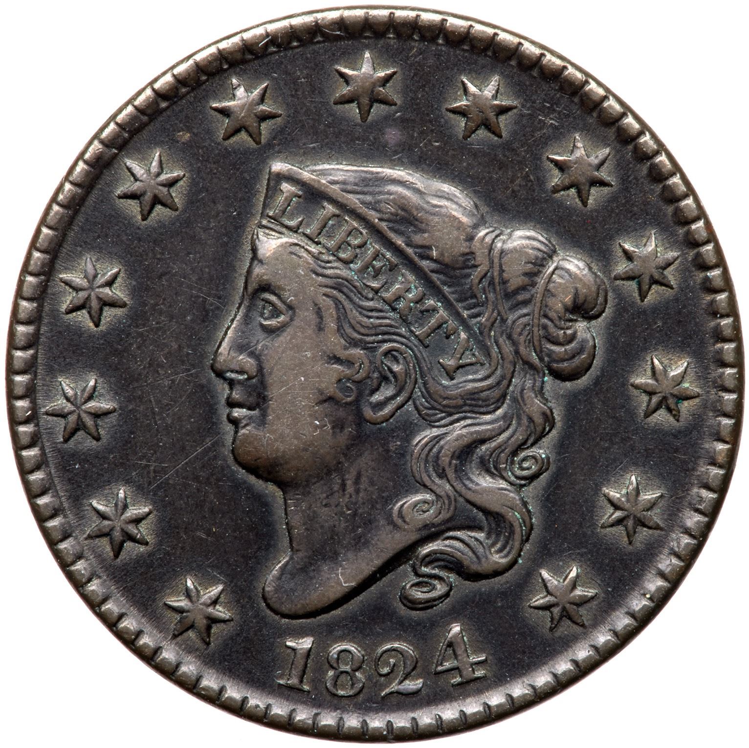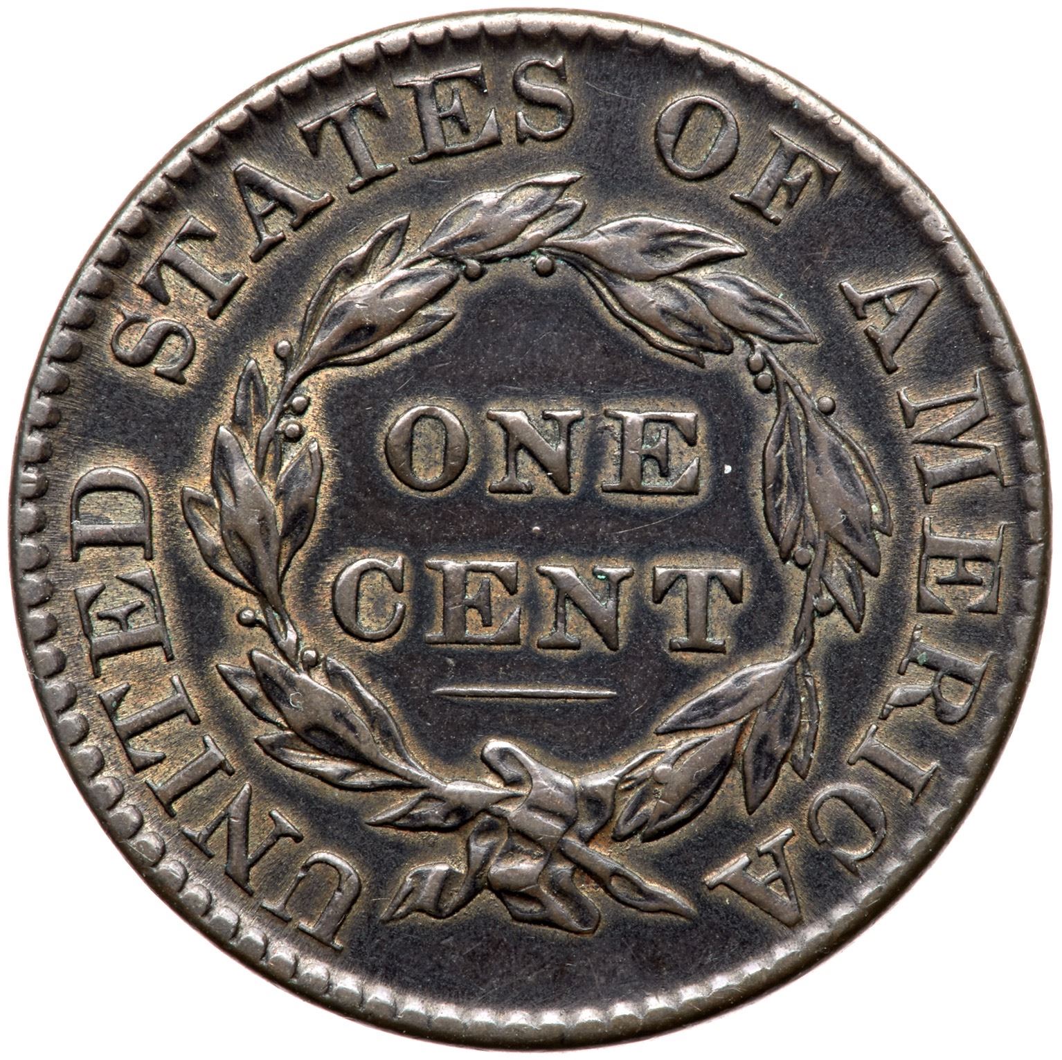 Frosty dark steel and olive brown with lighter steel brown toning on the highpoints of the devices. Light gray toning shows in the protected areas on both sides. The only marks are two light vertical nicks in the center of the neck. A nice cent, just darker than normal but perfectly smooth. MDS with crumbling in the upper notch of the N in ONE and upper notch of the 4, but without similar crumbling in the upper notch of the N in CENT.