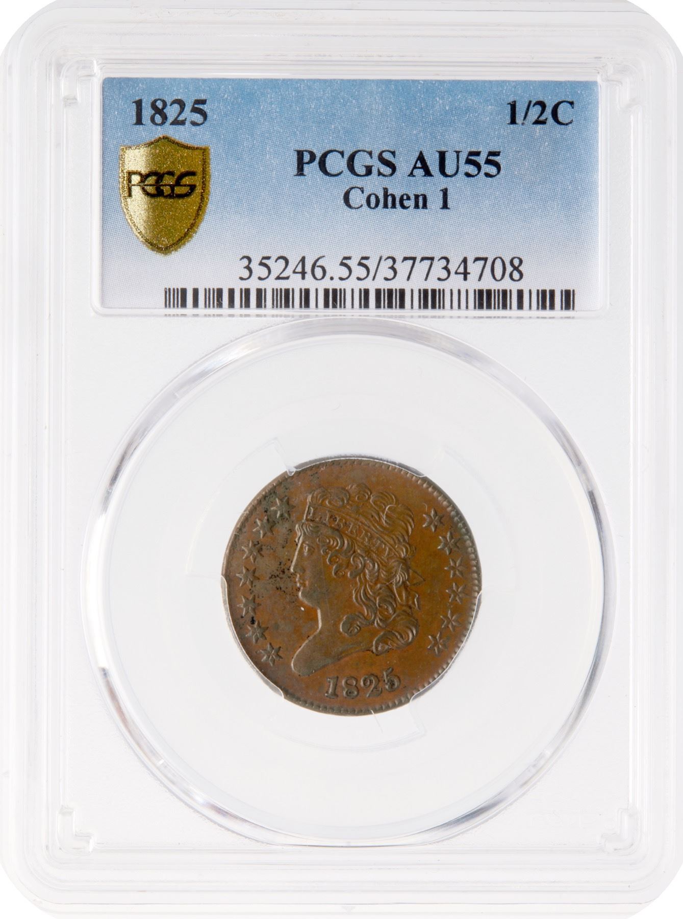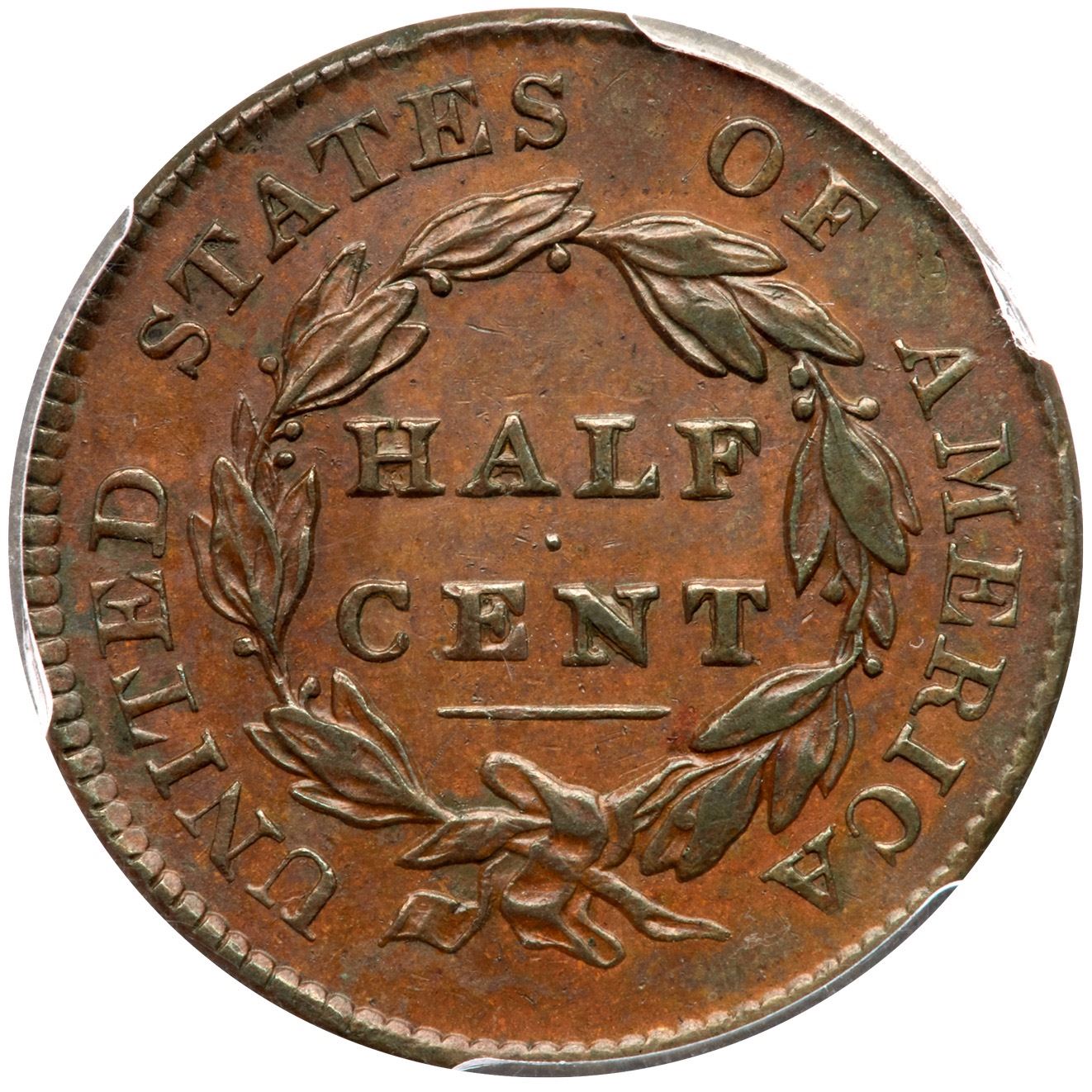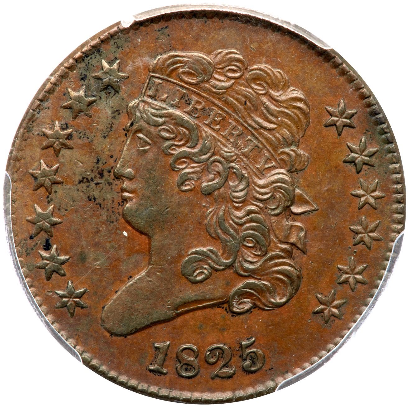 Glossy light to medium chocolate and light olive with tiny specks of dark olive brown in the field before the face. No notable contact marks, just a touch of friction on the highpoints of the devices. MDS. Manley state 2.0, with faint die clashmarks on the reverse. Our grade is EF45 sharpness net EF40 for the uneven toning in the field before the face. The attribution is noted on the PCGS label.