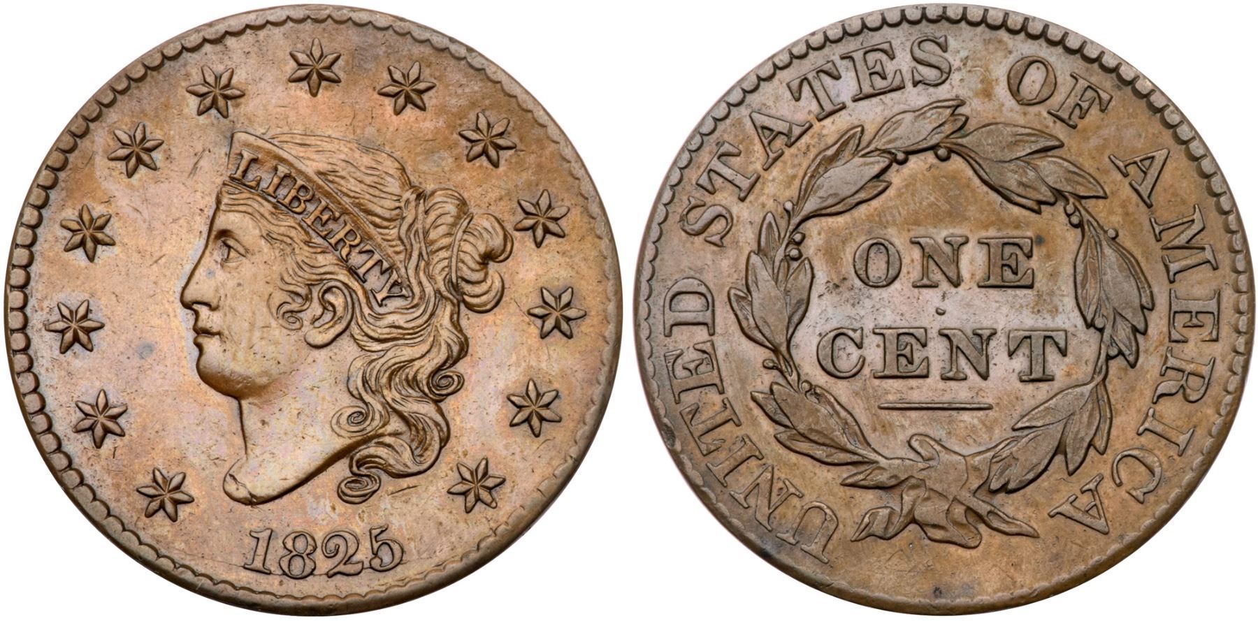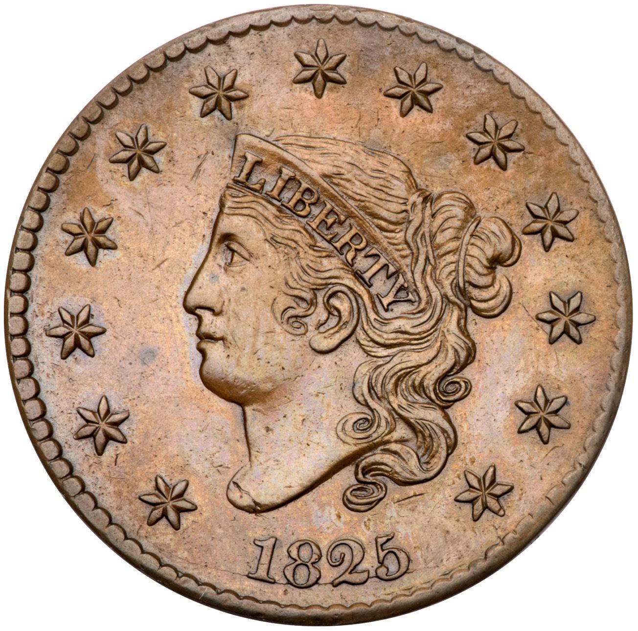 1825 N-1 R4 F12Glossy light brown with medium brown toning on the highpoints. A sharp cent but there is a relatively strong rim dent at star 13, and the details in the hair and stars have been expertly enhanced to give this cent very nice eye appeal. The work was accomplished with great skill, good enough to make this cent an important part of the Newcomb and Starr collections. E-MDS, die state b, with a fine die crack through the base of the date but before any crumbling or cud breaks in the dentils on the obverse. This is the plate coin for the variety in the Newcomb reference (Plate IV, item 1-A). Comes with a great provenance.Certificate Number: Pedigree: Ex Howard R. Newcomb, J. C. Morgenthau & Co., 5/16/1945:563-Floyd T. Starr, Stack's 6/13/1984:171 (as VF25)-Fred H. Borcherdt Collection