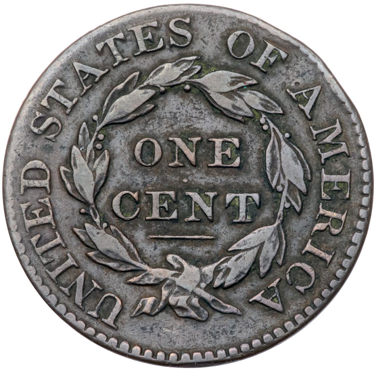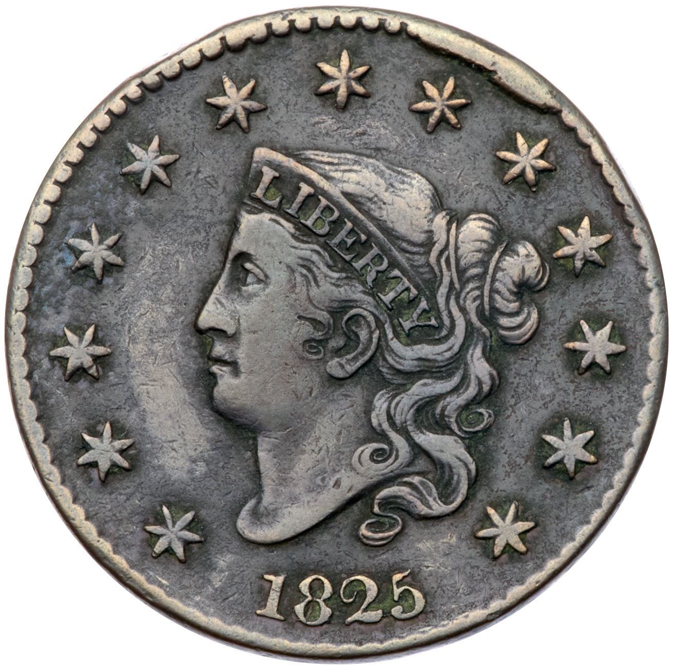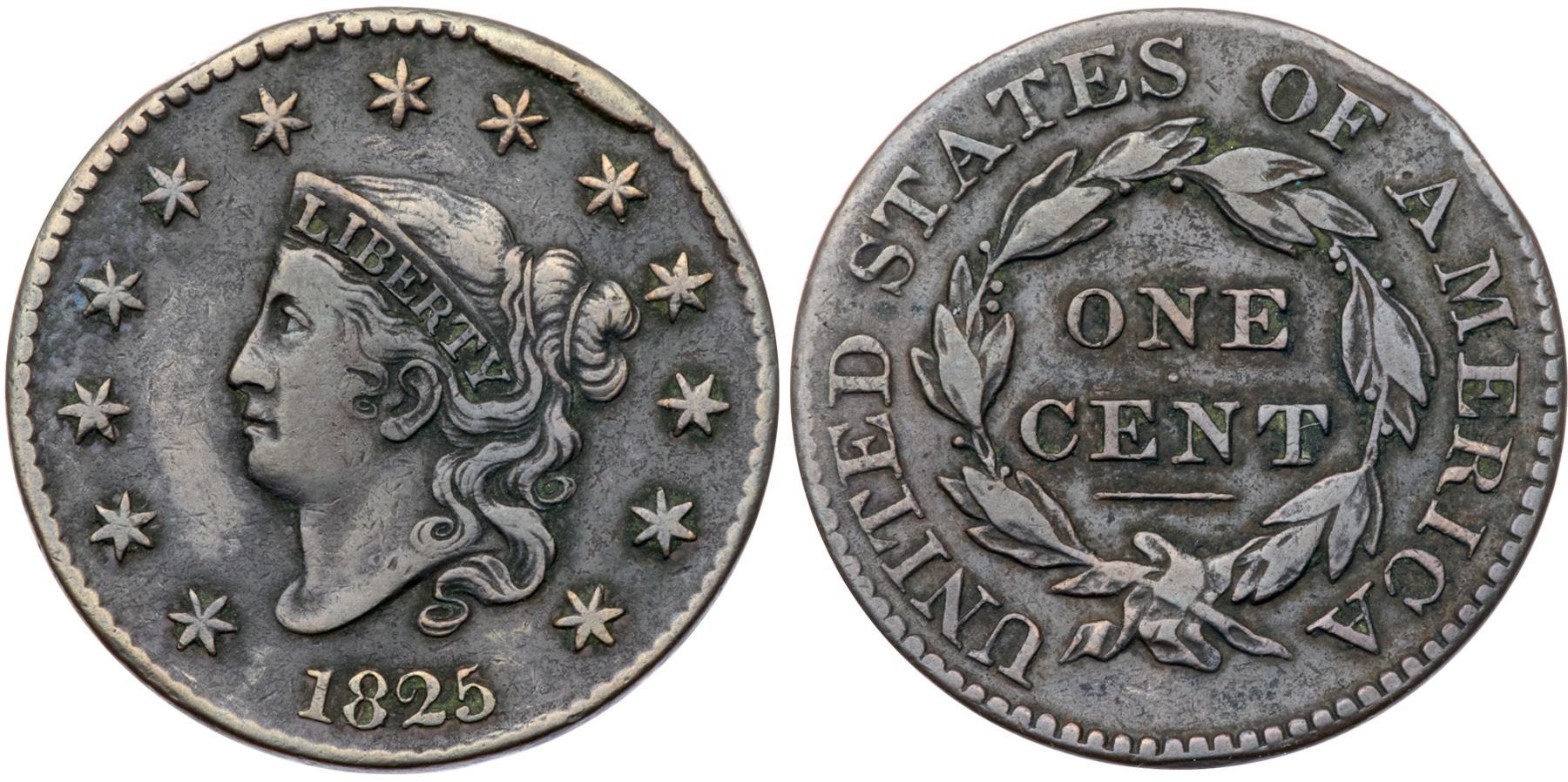 1825 N-1 R4 F15At least 10 points sharper but covered with very fine roughness and there are a couple rim bruises at OF-A. Slightly glossy dark steel and olive brown with lighter steel on the devices. M-LDS, die state d, with clearly defined cud breaks from star 7.5 to above star 9. A rare die state.Certificate Number: Pedigree: From the Fred H. Borcherdt Collection
