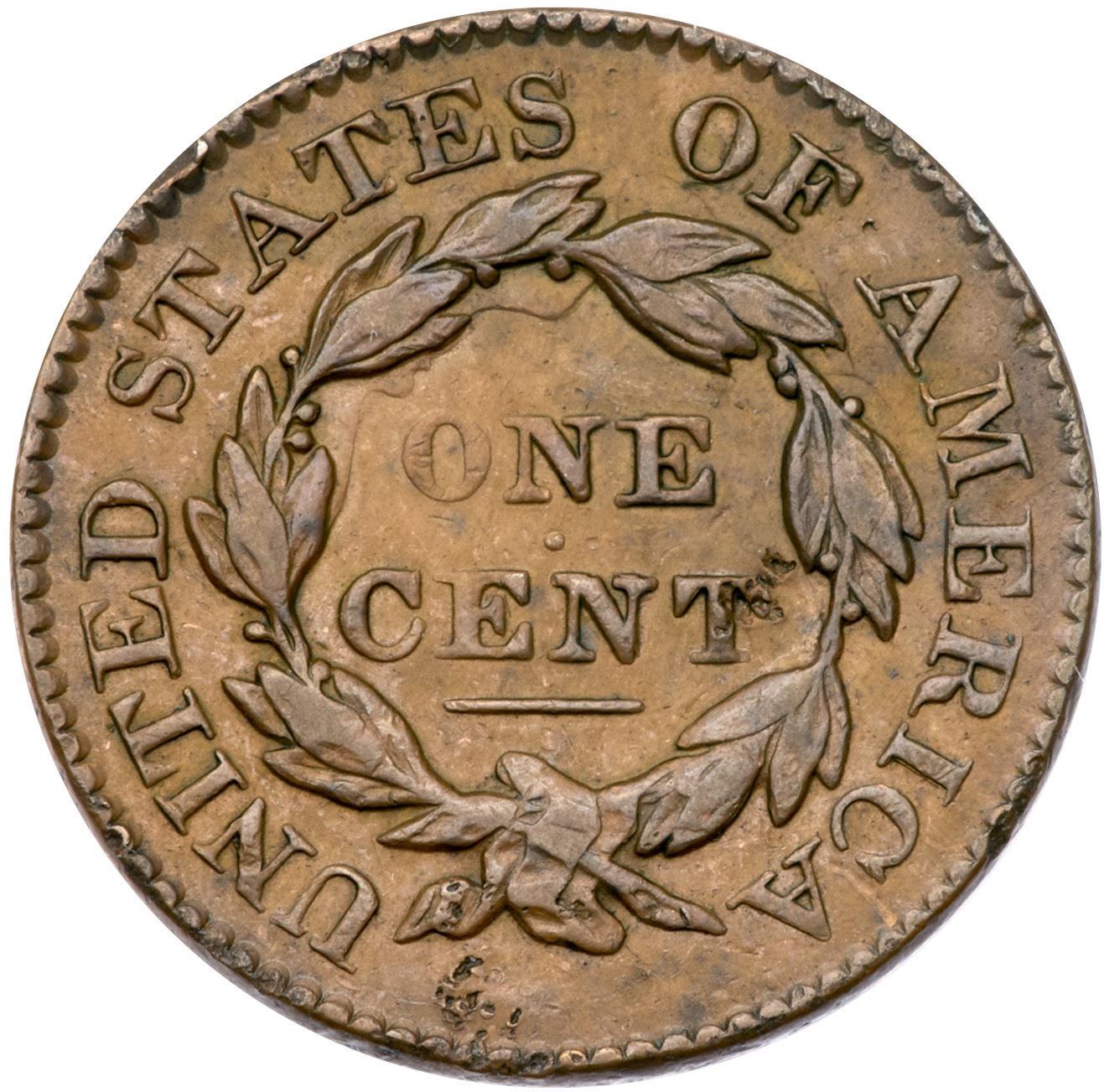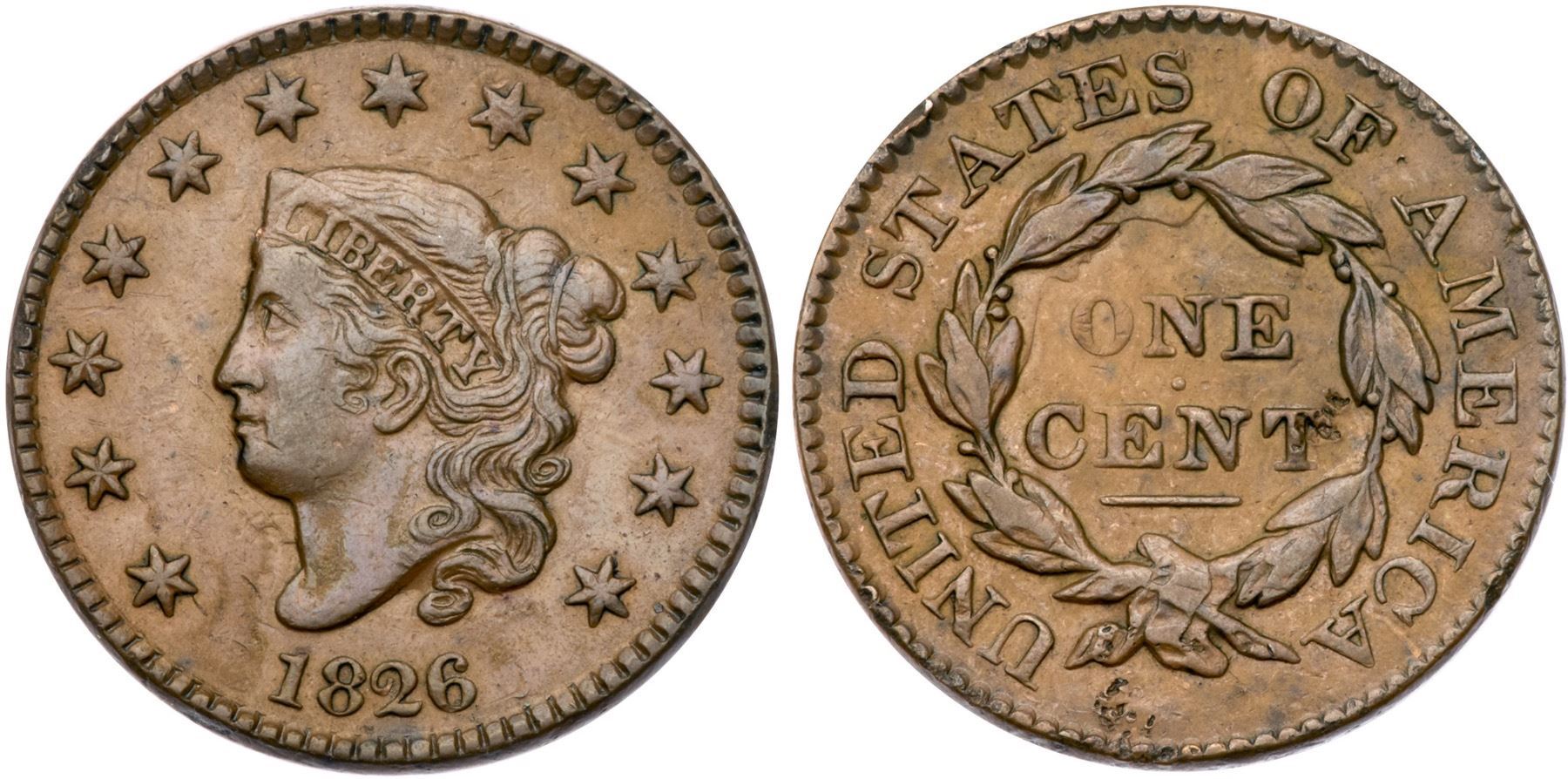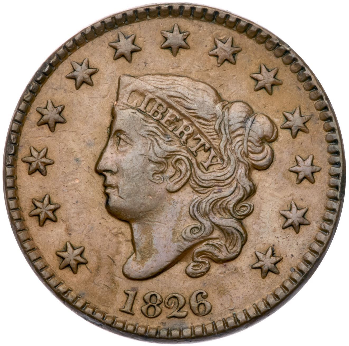 1826 N-7 R1 VF25Glossy tan and light brown with slightly darker brown on the highpoints. Would rate a higher grade but there are some contact marks on the reverse including a couple rim nicks over AT in STATES and small digs at the right top of the T in CENT. E-MDS, die state b, with rotated die clashmarks on the reverse.Certificate Number: Pedigree: From the Fred H. Borcherdt Collection