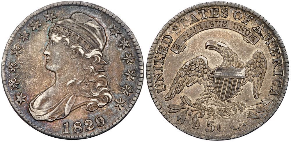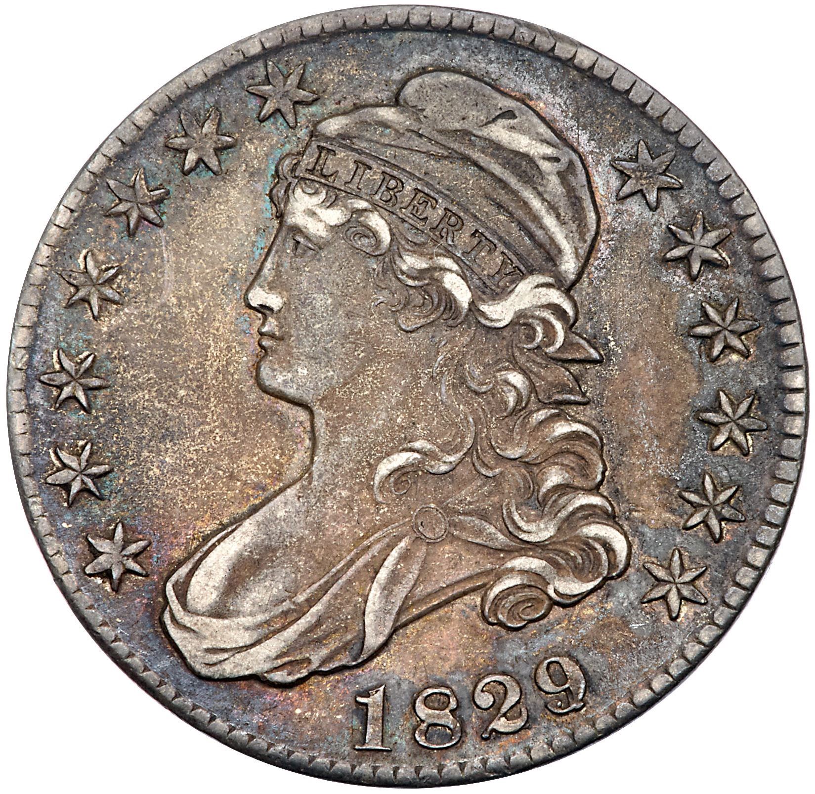 1829/7 Overdate 9 over 7 Overton-101 R1 PCGS AU50The obverse is light brown and darker gray with lighter highpoints; the reverse is frosty light silver with light grayish steel on the highpoints. Mint frost covers the protected areas on the reverse. Sharp and attractive with very light friction on theCertificate Number: 59098132Pedigree: Ex Fred H. Borcherdt Collection
